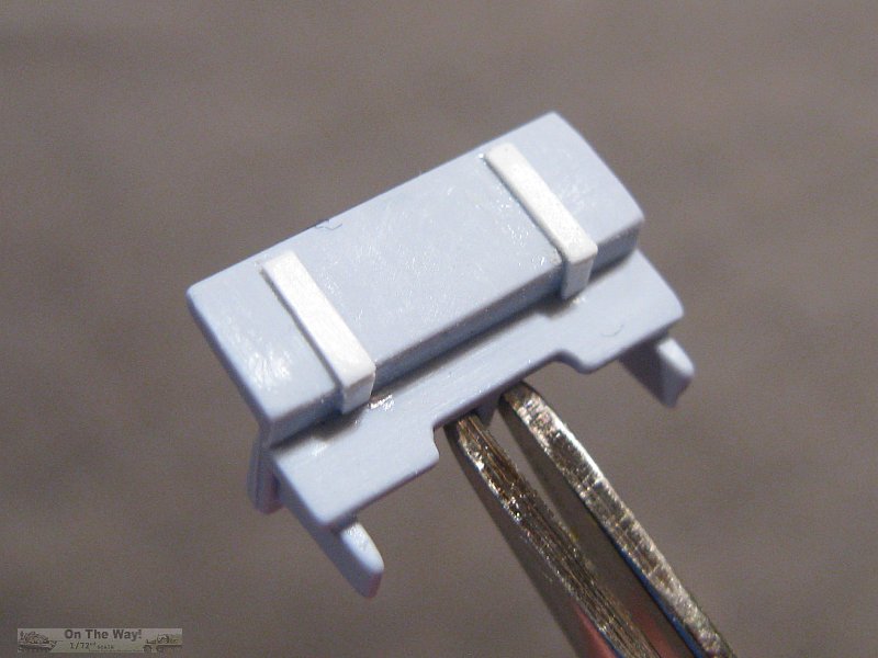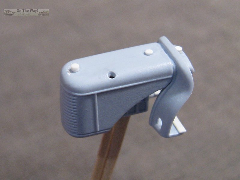 - The battery box (D13) is best left off to ease painting. I fastened a locating block on the fender to help center the box when it is glued into place later.