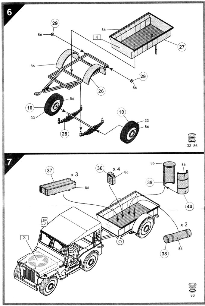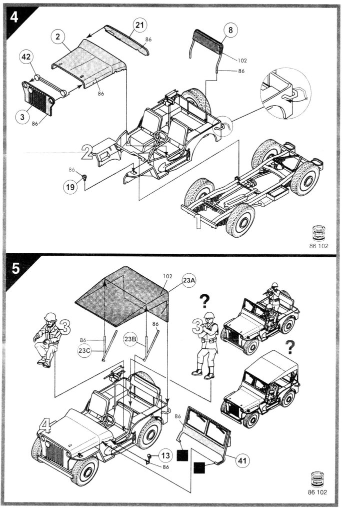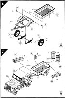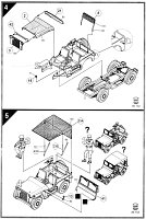 Like all kits you find a few disappointments. No decals are provided for the dashboard instruments. In my opinion this is one thing manufacturers need to do when marketing a vehicle with an open compartment. The decals are very poorly printed; the larger images such as the star insignia show obvious pixilation to the point where you can almost count the dots that make up the image. I did not use any of the decals supplied other than the yellow bridge weight disk, and I made sure that it got right dirty during the weathering process to hide the poor printing. And while I'm on the subject of the weight disk, it is molded right onto the grille (part 3), which will make removal difficult should you wish to build a version that doesn't need one. A nice cover is provided for the passenger compartment but if you leave it off there is no folded framework as you often see in pictures of jeeps with stowed covers. There is a variety of indifferent parts. Jerry cans are too short and squashed, the tools are molded directly to the body, and the leaf springs have no detail for the individual leaves in the spring.