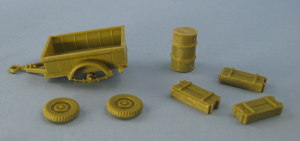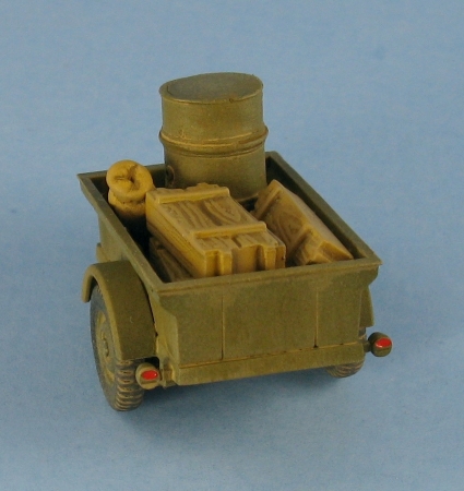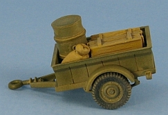 Stowage for the trailer is hit-and-miss. Offsetting a set of acceptable wood boxes and a fuel/oil drum is another poor jerry can which is squashed much like the other ones for the jeep proper and a set of rather featureless tarps. The connecting circle on the trailer's tongue is much too large and thick to fit into the trailer hitch.