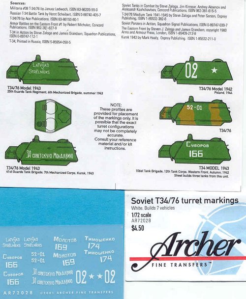 Includes white number markings and turret slogans for five T-34-76 tanks. Markings are sharp and opaque. I have used the similar ARCHER T-34-85 markings and found them easy to apply and looked great. Keep in mind that that these dry transfers are different than wet applied decals. Dry transfers are best applied over a dull (non-gloss) surface. No protective clear coat is required though if the model is expecting much handling, one or two LIGHTLY applied clear coats should be sprayed on. Do not brush on the clear coating.