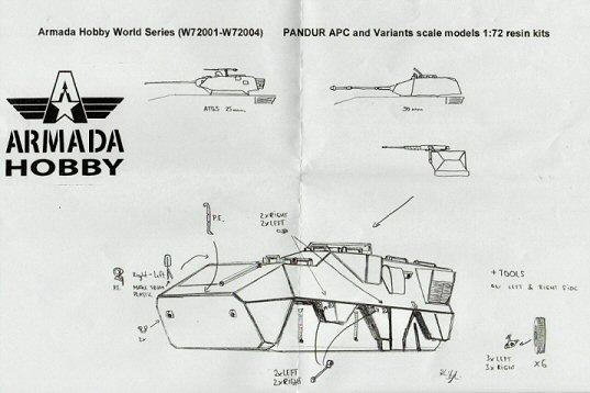 Armada Hobby recently released in kit form four versions of the Pandur I family, a 6x6 light armoured vehicle manufactured in Austria in the nineties. Used by Austria, Slovenia (where it’s called the Valuk), Belgium, Kuwait and the US Special Forces, this family, being C-130 air transportable, has seen widespread use in UN and NATO missions and is therefore a welcome addition for fans of modern stuff. The base version of the family is a HMG armed infantry carrier. These are supported by specialised variants, like ambulances, command post, mortar carrier and maintenance vehicles. The Kuwaiti National Guard also uses a number of turreted versions; one variant having a 25mm M242 Chain Gun, the heavier brother of the family being armed with a Cockerill 90mm gun. Some years ago, Belgium even went one step further and converted its family into reconnaissance vehicles by installing a day/night observation pod on a retractable mast in the rear compartment. The kit arrived, packed in a sturdy cardboard box, but inside, the zip lock bags containing the resin parts, could move freely. As a result, some small parts, like axles and pins, had been broken off from their pouring blocks. But
