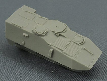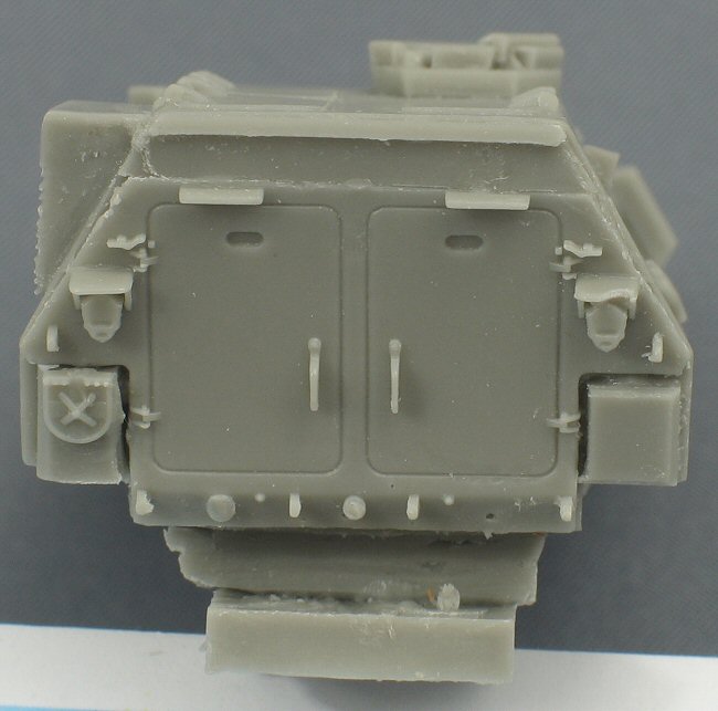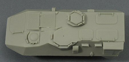 The Pandur hull is a complicated multi-angle affair, which Armada Hobby has succeeded in reproducing correctly. I checked the dimensions against a real (Belgian) vehicle and apart from the lower crew compartment, everything was within my tolerance range. The hull is cast in one massive piece, which will make the finished model rather heavy. All hatches and doors are moulded shut, which is a pity. The prominent anti slip texture, present on the horizontal surfaces of the real vehicle, has not been represented. The pistol ports are missing on both sides. This however can easily be added. The air-condition box (the big square box on the rear part of the left side) is very nicely reproduced. There should be a similar, but smaller box on the right side; this one however is missing. |