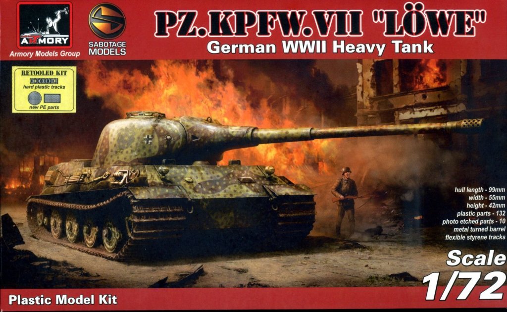 The Panzerkampfwagen VII Löwe(Lion) is, among all the so-called "paper panzers", one of those which came really close to effective production. It was originally designed by Krupp in the early months of 1942 as Pz.Kpfw. VII Löwe (VK7201). Designers planned to build two variants of this vehicle: light (leichte) variant would have frontal armor protection of 100mm and it would weight 76 tons. Heavy (schwere) variant would have frontal armor protection of 120mm and it would weight 90 tons. Both variants would be armed with 105mm L/70 gun and coaxial machine gun. It is known that 90ton schwere Löwe was to have its turret mounted centrally and in overall design resembled future Tiger II. In late 1942, this project was cancelled in favour of the development of the Maus. Judging from blueprints, the tank proposed by Armory, having a central turret, is the leichte Löwe. This vehicle gained quite a bit of popularity in the famous World of Tanks (WoT) online multiplayer game, so that Armory provides a "historical" and a WoT version (with different muzzle brakes and engine hatches on the back panel). |