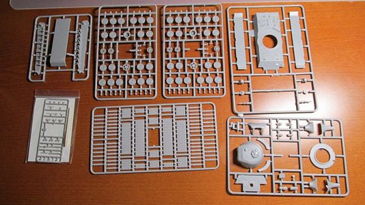 Packaging On opening the box, you find 6 large sprues in light grey plastic and a small bag containing another sprue with tools, 1 PE set, a turned metal barrel and 1 small set of decals with some tiny german crosses. |