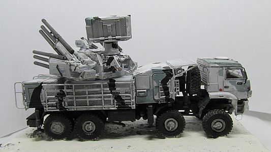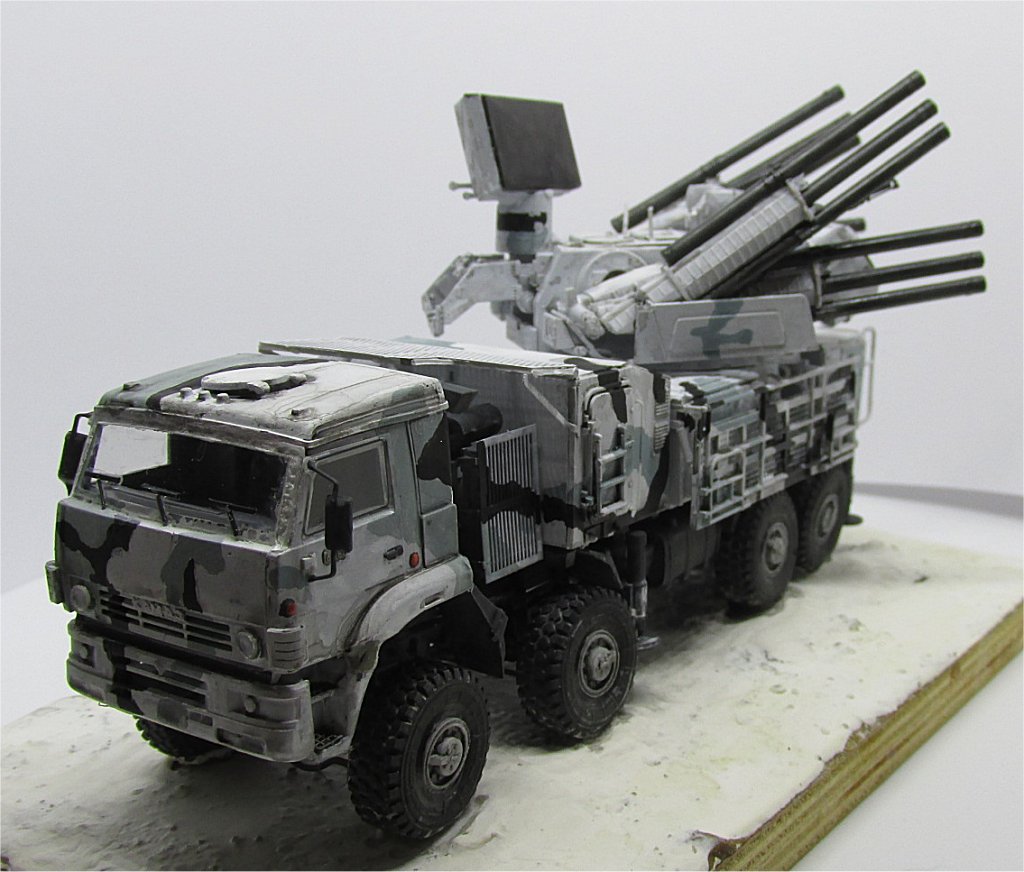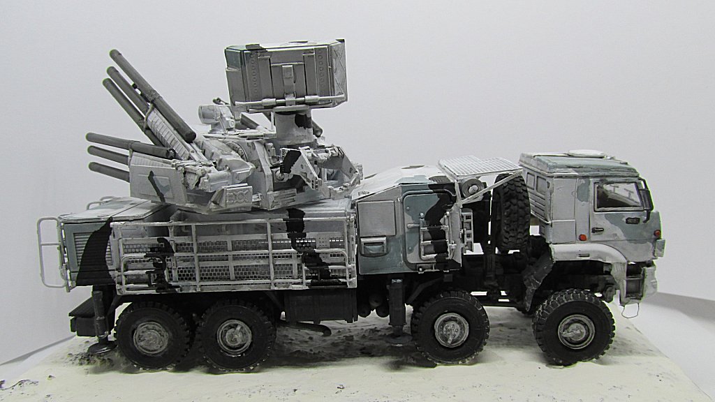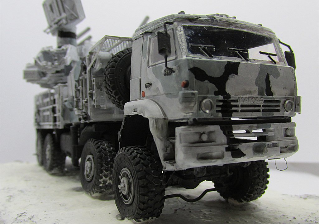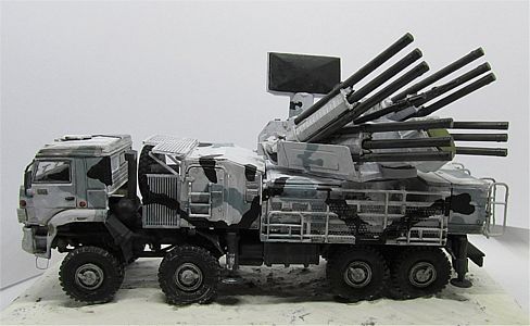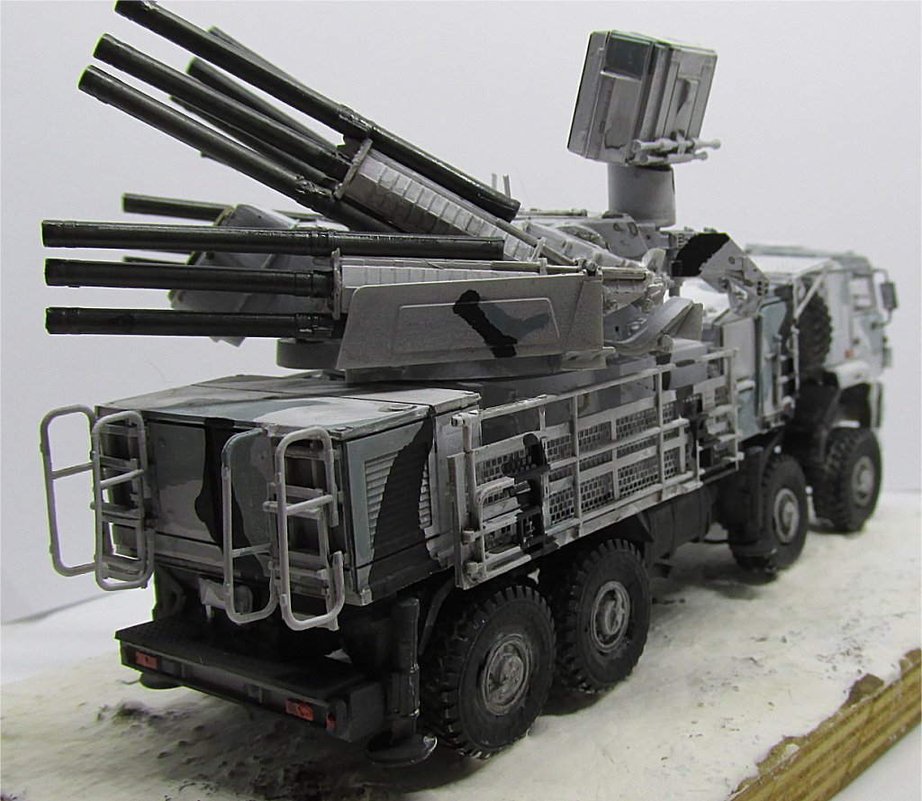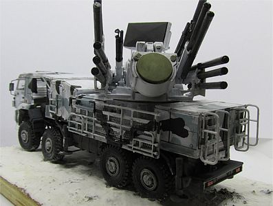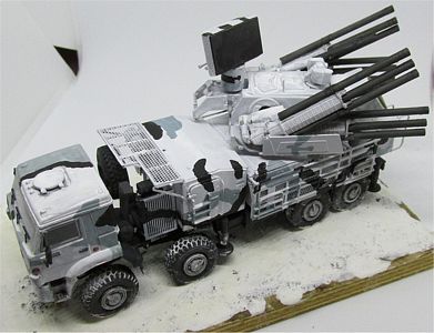 Painting the Pantsir may be fun, because there is a wide variety of schemes effectively applied, from plain green or plain sand to green/sand, green/white, grey/black/white. I chose the attractive Arctic scheme of white/gray/black (or dark grey).