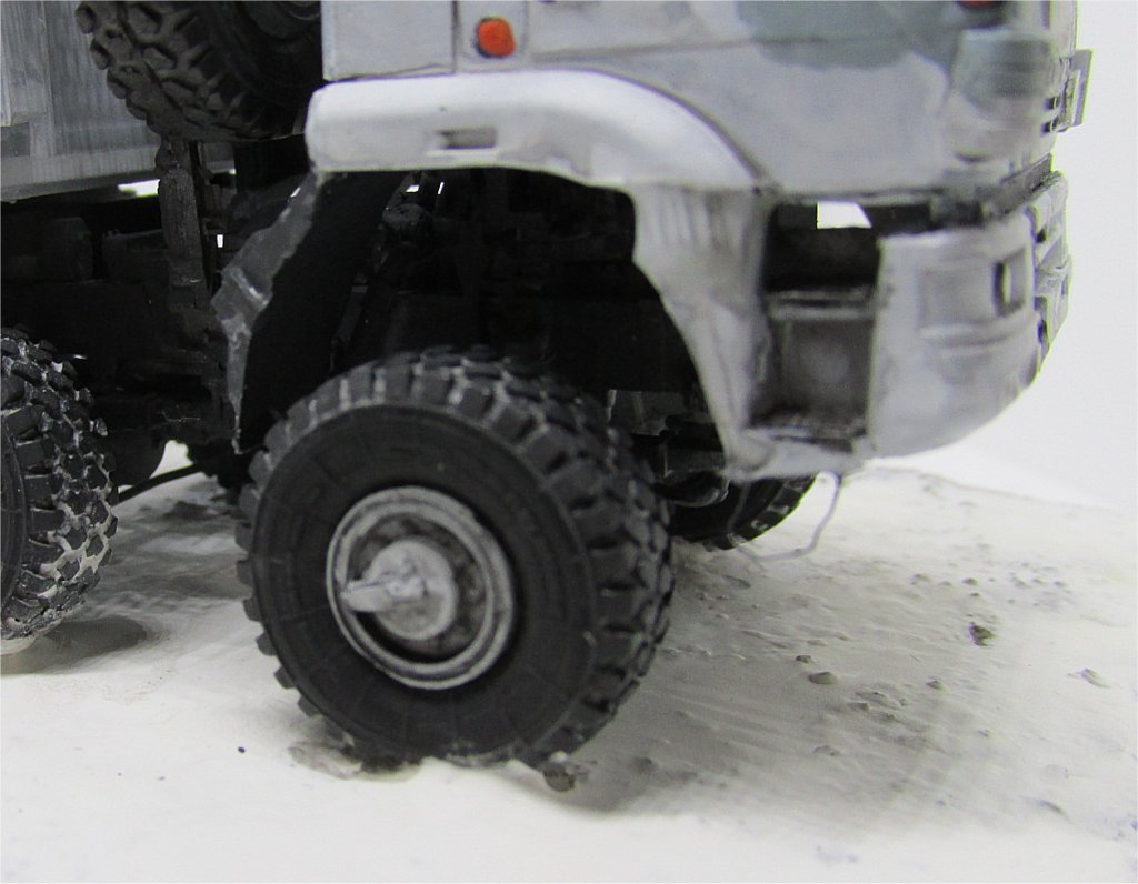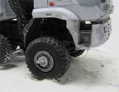 On assembling the rear suspensions (roughly step 8) I noticed too late that, if positioned exactly on the notches present on piece A24, the rear wheels sits too low, giving the whole truck an innatural look, so they should be repositioned a bit differently, but it is something you will notice only when the wheels are positioned. A good idea would be not to glue pieces B2 and B3, which sustain the whole assembly, on piece A24 until very late. Anyway, I would suggest positioning the wheels after step 15, not in step 49 as the instructions suggest you to do: if positioned early, you will be able to detect and correct misalignments before it is too late. About the wheels, the tyres are supplied in resin, well cast and with a realistic thread pattern; the hubs must be inserted, but, unless you work hard on them, they protrude a bit too much. I had to re-do them all because I did not notice this error (see 7th picture of the finished model below, which was takenbefore modification) Since correcting this mistake takes a lot of work, it would have been better to cast the wheels in resin complete with hubs.