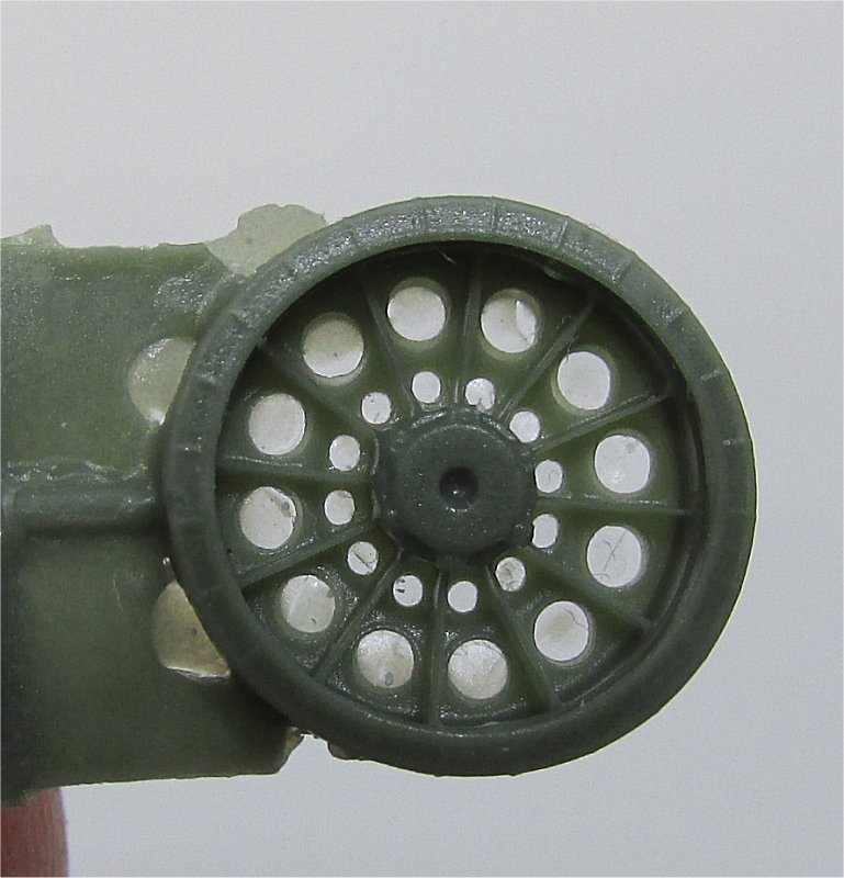 | Early T-54 versions mounted a type of roadwheels generally nicknamed "spider-type", because they resembled a cobweb: they had 12 reinforcing ribs, 12 large lightening holes and 12 small lightening holes closer to wheel hub. The tyre was solid rubber without any perforations on the side. the T-54 road wheels were extremely similar to those mounted on late T-34/85, so that most people think they were the same. On the contrary, T-54 spider wheels are smaller in diameter and larger in width, although I doubt these small differences would be visible in 1/72nd scale. Starting from T-54b, "spider-type" wheels were replaced with the "starfish-type" wheels, which had to become so characteristic of the whole T-55/T-62 family, and older models had their wheels replaced with the newer ones when back for repair. However, it was not very rare to see a T-55 or T-62 with a mix of "spider" and "starfish" wheels, as the older wheels were seldom used as "on-field" replacements. The parts are very well cast, with discrete sprue gates and a good amount of flash, which would force the modeller to clean every single hole (there are 240 !). Hubs are provided separately and they have the correct number of bolts. The instruction leaflet is quite useless because it is not hard to understand how to assemble the wheels.