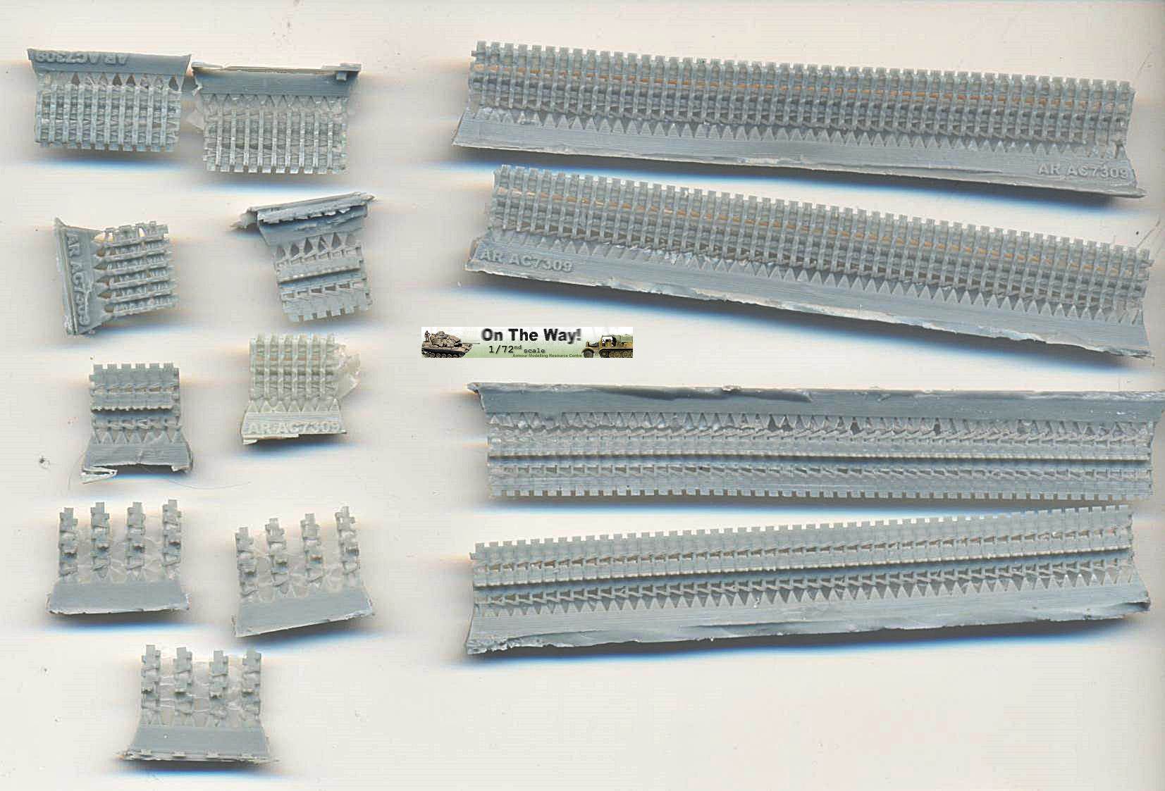 | After the first encounters with the Russian climate (and its effect on the road conditions), Germany developped wider tracks for their Panzer III and Panzer IV (and their derivatives). Two types saw service: Winterketten and Ostketten. The former (which appeared first, in the Winter of 1942/43) was basically a standard track with extensions (similar to "duckbills" for Sherman tracks), while the later was a wider, more uniform track, somewhat reminiscent of a Panther track. This set of Ostketten is based on a late type track (with chevrons). Note that Ostketten are very rare on Nashorns and Hummels, while much more common on StuGs and PzKpfw. Technically, there is no reason the Nashorn/Hummel could not be fitted with Ostketten, as the tracks were exactly the same as on the StuG III & StuG IV and PzKpfw III and PzKpfw IV. Still, the only picture I have found of a Nashorn with Ostketten so far is on page 30 of Nuts & Bots 14 (also shown here). Given that the tracks of the Hummel and Nashorn were a tad longer than those of the Panzer IV and even more so than those of the Panzer III, I guess that buying this set will allow you to procrastinate when making up your mind about the vehicle to use them on. The parts
