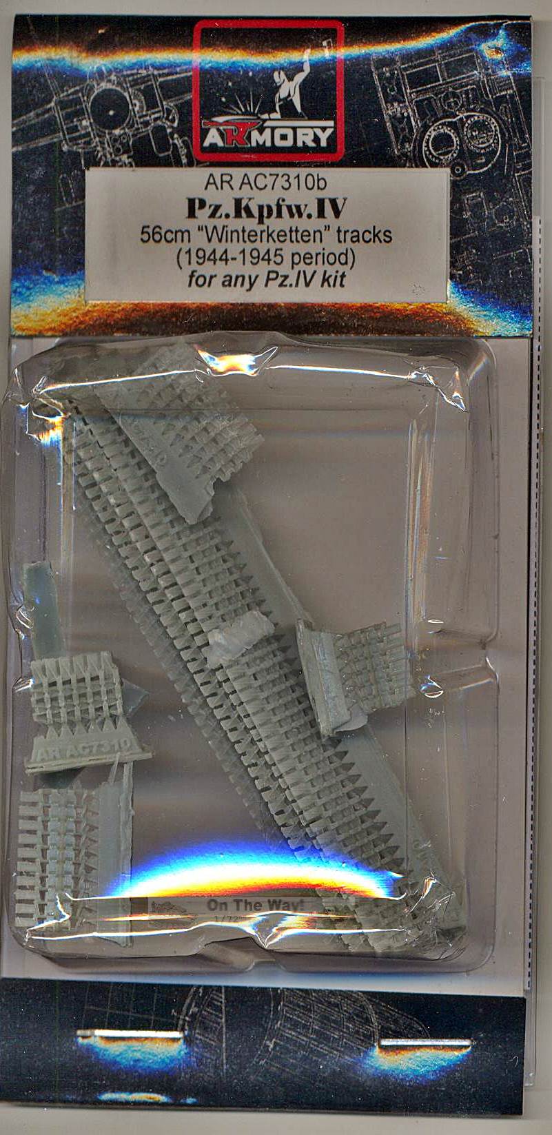 After the first encounters with the Russian climate (and its effect on the road conditions), Germany developped wider tracks for their Panzer III and Panzer IV (and their derivatives). Two types saw service: Winterketten and Ostketten. The former (which appeared first, in the Winter of 1942/43) was basically a standard track with extensions (similar to "duckbills" for Sherman tracks), while the later was a wider, more uniform track. This set of Winterketten is based on a late type track (with chevrons), which is the reason for the "1944-45" label. I am not quite sure how common this was, as I always believed that Winterketten would have been supplanted by Ostketten by that time. The parts