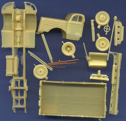 As a 7 ton capacity truck, it's a fairly large truck, so the kit is as well. As is normal with Art-Toys, we get several very nicely detailed resin parts, all cast exceptionally well, with only some paper thin flash, and one or two very minor pin holes in the resin. This kit is not as complex as something like MarS, but there is a fair amount of work involved in putting it together, so nice instructions are included. In fact, the instructions are a great improvement over previous kits I have seen, and are perfectly adequate for the job, without need to consult other photos of the truck. Two brass rods are included for the wheel axles, and two lengths of copper wire are also provided for the truck width indicators. Barely visible in the scan is a small square of clear acetate for the windshield, which I promptly lost when removing it from the scanner. It couldn't have gone far . . . This is another exceptional truck kit from a company that seems to specialize in trucks. My only complaint is the closed doors on the cab. It is very unusual for a company to mold the cab doors open on truck models, and I sure wish they would start to do so. Thank you very much to Tracks & Troops for the providing the review item. |