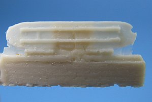 Pictured above is an overhead shot of the carriage with side views of the other parts. They are rife with pin holes. Flash is present but not to a large degree. Also evident is the incomplete casting of pieces resulting in voids in the resin as seen by the notches in the edge of the shield and the missing section of handle on one of the ammo cases. Another picture of the parts, showing a side view of the carriage and with some of the other