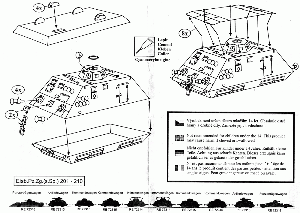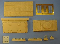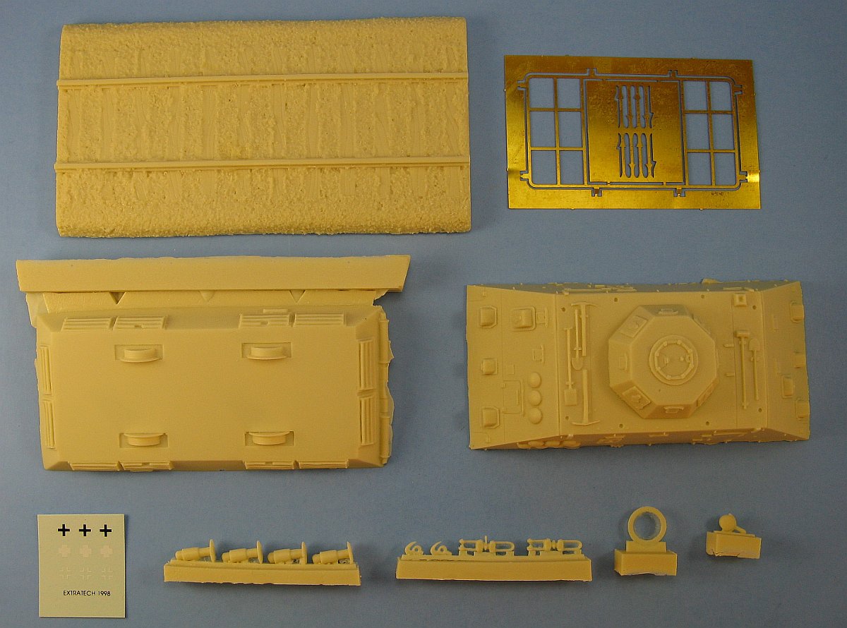 Inside the box are 13 cream/bone coloured resin parts: 12 pieces for the vehicle itself plus a railroad section base. There is a small decal sheet containing six Balkankreuze in three styles - two solid black, two solid white and two white outline only. A small photo-etched frame is provided for the bed frame antenna and its four mounting posts. One oddity was found in the instructions, which shows the wheels as separate parts to be glued to the lower body pan, but in reality the wheels are molded integrally with the pan. Somebody wasn't dropped the ball here! Before construction could commence an inspection of the parts was done to identify any holes and to check the general quality