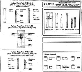 The set comes with 10 rounds of 8.8cm ammo, one empty shell case, five open boxes, three closed boxes and six closed shipping tubes. For the 7.5cm long, we get 10 whole rounds, one empty shell, five open boxes, and three closed boxes. And finally for the short 7.5cm, we have 10 complete rounds, one empty shell, and 11 shipping tubes. Comparing the accuracy of the sets, we have