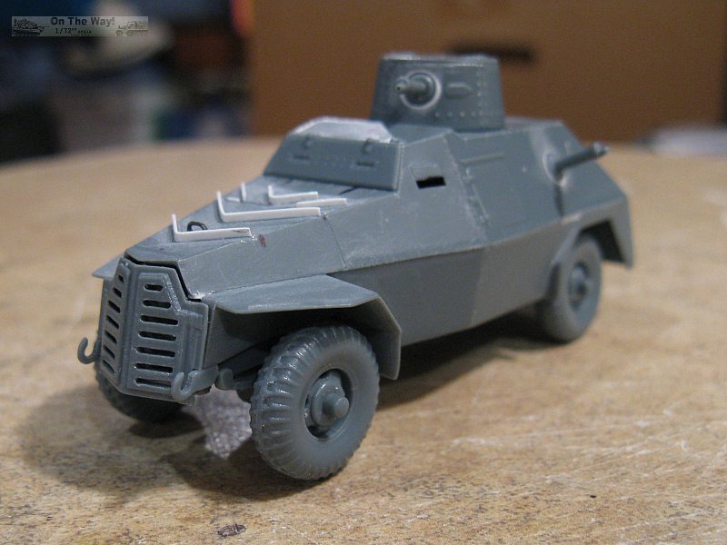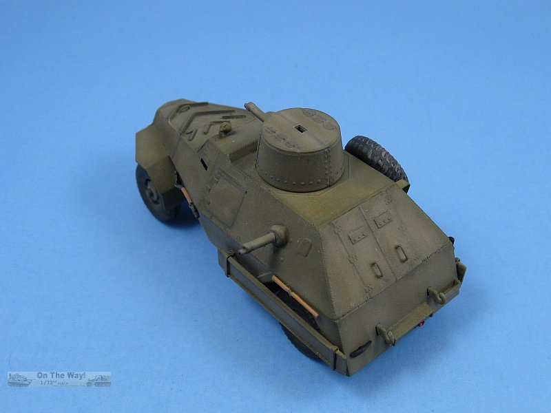 wheels touched the ground. The bracket on the rear hull and the tow rings have been added. The small black dot is where I figure the spare tire will be mounted. The