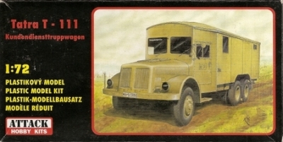 Brief Description of Contents The kit comprises over 70 parts, including a small frett of etched brass and clear plastic for the windows. Many parts are common to the Tatra T-111 open cargo truck (Attack 72836). The difference between this and the open cargo truck is the enclosed van body, & the drivers cabin roof. The chassis and drive train, and rest of the cabin are the same in both kits. The kit is cast in pale grey & black plastic, the wheels also being cast in one piece hard plastic. Decals as per box art, with two choices of WH number plates. Construction As with the open truck body, The entire drive train, axles, suspension, & exhaust is cast as one piece, and the piece supplied with this kit was badly out of shape. It had two large bends, making it resemble a long tilde (~) instead of being flat. The sprue it was attached to was also in the same shape, and I could find no stress discolouration where the two bends were, so it appears it was cast in this shape, or hardened in this shape. Fortunately the plastic is soft, rather than brittle, so I was able to bend it back to a flat shape. The cabin pieces are a fairly good fit, the radiator needs some fine sanding to ensure a flush fit. The driver's cabin doors are moulded shut. The bottom, sides, ends and roof of the van body were a reasonabley good fit, but all needed a fine sanding on the edges to get a flush finish and very light filling was also needed on most joins. The rear door can be assembled open, the side door is cast closed. I didn't like how high the van body sat up over the chassis. Comparing this to the two photos I have of this vehicle, one of which is a side shot, and to the instructions and box art, it was clear that the van body was sitting way too high in this kit, very noticeable over the wheel arches. I considered how to address this problem. There is no easy fix - and I couldn't just ignore the problem, it was visibly very wrong. In the end I sanded down the chassis (which is two long parallel beams that run almost the length of the vehicle) by a millimetre or so, then sanded down the underside of the van body floor, as well as sanding two deeper 'grooves' so the floor of the body would sit a bit lower on the chassis. This solved the problem. As a consequence I also had to sand down the underside of the drivers cabin roof by perhaps a millimetre to lower it to the right level to join the body. I didn't like to do this but it was essential, and less noticeable than leaving the body riding too high. Photo references are very handy to see the height the body sits on the chassis - Google if you have none. The two spare wheels are supposed to fit under the van floor, into cutouts in the chassis beams. However these cutouts are blocked by moulded supports on the van floor which attach to the chassis. No easy fix for this, unless you cut off the supports, I prefered just to leave the spares off. The rest of the kit went together with little problem. Some sanding needed on most pieces, particularly the wheels, which have a cast line right around their circumference. One trouble I found was the width marker poles on each front mudguard. The markers supplied are very not round, more of a flattened elliptical shape, and an attempt to file them resulted in instant breakage. The brass frett duplicates these, but is also not very useful as they are very flat, rather than round. I replaced them with lengths cut from a common household dressmaking pin, as the diameter seemed about right, and fastened the round knobs to the top with brush on super glue, and rebrushed them with generous amounts of superglue on subsequent days to get them solidly fixed. I also think the vents and flaps on the engine compartment look a bit softly cast, which makes it hard to accentuate and highlight their shape. Window wipers are not supplied, I made some from paint brush bristles cut to size, each being two pieces to represent a wiper arm and wiper blade, glued with white glue. I made small brackets for the shovel and pick from some thin flat rod. I added two crew in the cab from the spares box. The exterior rear view mirror is the sole piece of brass. I cut a small slit into the cab side to insert the bracket, held with super glue. Unfortunately I placed the external rear view mirror too low, it should be at top of driver's window, not the bottom. Accuracy I'm not an engineer, and have no technical specs for this vehicle, so I don't know how to scale this model is.