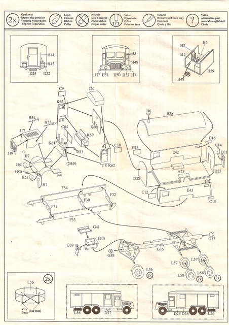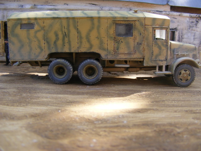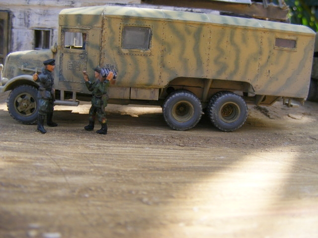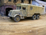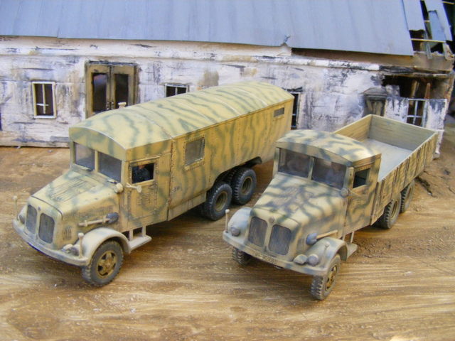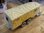 Painting The instructions say to use Humbrol 94, which they call Sand Yellow. I'm not sure if Humbrol have changed their colour mixes, my recently bought tin of 94 is medium brown. For this reason I created a Humbrol enamel mix to try to match the box art - basically Humbrol Matt 83 with a quantity of white added. The few B&W photos of these trucks seem to indicate they were painted a very pale yellow. (These trucks were produced and supplied to the German Army from 1943 to 1945). The paint guide supplied shows a version with green sprayed lines. I bought a tin of Humbrol Enamel Matt 117 as it's a lighter green and closer to the box art and I roughly followed the guide. I highlighted rivets by gently running the blunt side of an exacto blade over them to remove the paint, to indicate wear, and also used the blade to scratch paint around door handles and door openings. Conclusion This kit was a pleasure to build and I'm quite happy with it, but you do need to do a bit of filing and sanding to get it looking the same as on the box, in the instructions, and wartime photos, with regard to the height of the van body. This is a large beast of a truck, made in 6.5 & 8 tonne versions - as long as a Famo, but not as wide. If you just want one example of the Tatra T-111 family, the open truck version is the easier build, though for me this one has a great boxy look. |