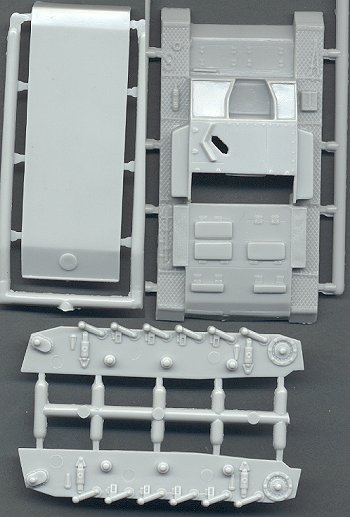 Aside from the fact that this is a limited-run kit, I am rather disappointed in the hull details. The fenders in particular are quite poor, with an exaggerated treadplate pattern. The pioneer tools that are molded onto the fenders are truly awful. But the chassis is very good.