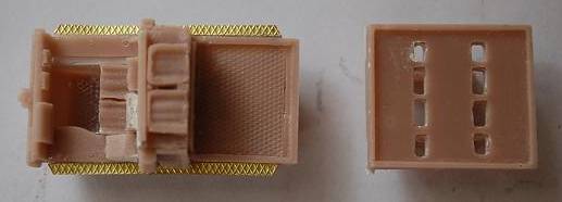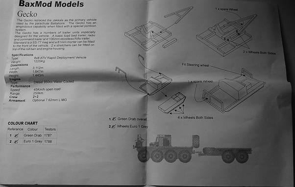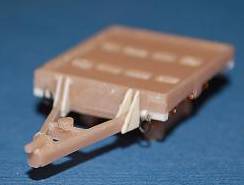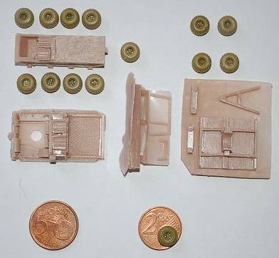 The hard cardboard box is typical for BaxMod with a picture of a finished model on top. All resin parts are packed in a clip opening plastic bag. The 14 separate wheels are not fitted to carriers what makes me think they have been moulded separately, probably by an other manufacturer as their detail and resin used is far superior than the BaxMod resin.