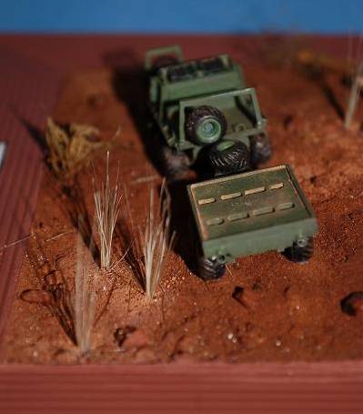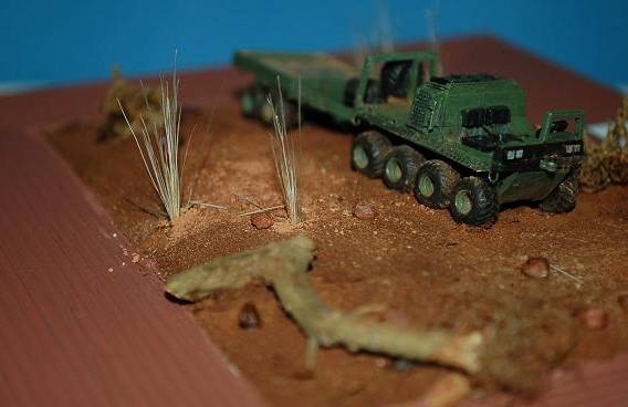I decided to present the Gecko on a small vignette of a South African bush scene. This was build up using a picture frame, an old Matchbox kit base, some modelling plaster, a piece of wood and some green scenery items representing grasses and bush. The sand covering the plaster is real South African bush earth with its typical red brown appearance. Some MiG pigments have been used to add some colour shades.