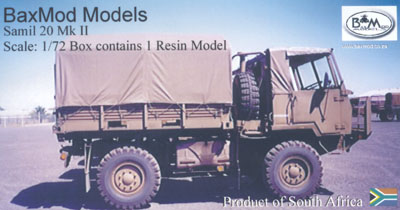 I have often lamented the lack of small scale kits of South African vehicles. So I was obviously delighted to hear about a company in South Africa called BaxMod Models (named after Chris Baxter, the owner) who was producing a very impressive line of kits of trucks, armored personnel carriers, and even artillery pieces, of the South African army. After making contact with Chris, he informed me that unfortunately his entire line of kits had been temporarily withdrawn from production, in order to make improvements to the molds. The first kit of his "new and improved" line is of the Samil 20 Mk. II truck. Chris' familiarity with the subject matter is obvious, having spent a lot of time himself in and around these vehicles.