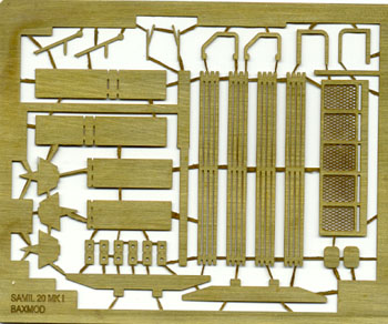 There are foot rungs beneath each door, which are provided in photoetch. Based on the photo on the box top, I would guess that it would be better to make these rungs out of bent wire, and attach a flat step plate to them instead. It might also be beneficial to use wire or plastic rod for the mirror mounts, but the etched parts don't look too bad either. The protective screen in front of the cab, and windshield wiper blades are also done in brass, and look very good. It would have been nice to have some clear plastic included in the kit to replicate the windshield.