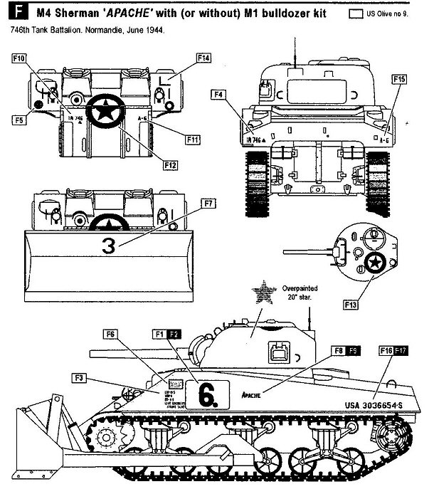 TB A-6 APACHE I’m not able to confirm the serial, however the sloped rear plate confirms a Pullman tank as suggested; it had the bolted transmission cover, the pistol port and the glacis horn. To apply the glacis star I'd cut it in four parts and then paint in white the flanges where the star should lay. The white paint hardly matches the decal white, so I'd also carefully overpaint the full ring. |