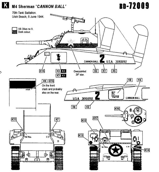 TB C-2 CANNON BALL This was an ALCO tank. In the two photos I’ve seen of this vehicle, the transmission cover is not visible. This subject is present in both the Dragon and UM decals, always associated to a cast transmission cover. However the serial 3066192 was the 208th tank of the 2nd batch and should be produced in April 1943. If I’m right it's highly possible it had a bolted transmission cover. For sure it had the pistol port (it had the appliqué armour on the right side and they are aligned) and the glacis horn. This tank had the attachment points for the rockets launcher on the turret. See here on Armorama or Missing-Lynx. |
