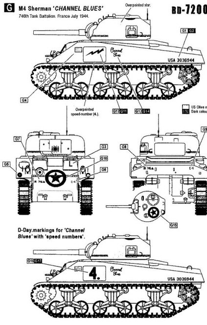 TB C-4 CHANNEL BLUES I’m not able to confirm the serial number. In the still I’ve seen the rear plate joint was covered by a camo net or something similar which makes is impossible to see if it was vertical or sloped; for sure it was not a Baldwin tank (it had the cast hoods). It had the cast rounded transmission cover, the pistol port and the fender horn. I’ve seen it only with the lighting, however the suggested hull side “4.” is correct for a 746th TB as well as the “L” on the glacis. |