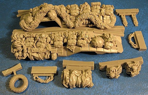 The Black dog resin is hard and light weight and may be molded in any color. My examples are green, light grey and dark grey. I have as yet to see any tan colored resin as the company portraits on their box tops. They seem to have also switched from a large box, 4 inches by 4 inches to a slightly smaller end-opening box that measures 4 inches by 3 inches. All parts are in a "zip-loc" baggy. This set, for the Dragon AAVP7A1 RAM/RS EAAK (Dragon kit no. 7233) has only 10 pieces: 2 rope sets, a spare tire and 2 stretchers are among the parts, with the large up-armor sides and a host of gear being the largest. The left side (with the vehicle facing you) has many small holes in the bottom of the equipment on my example, but they will be easy to fix. |