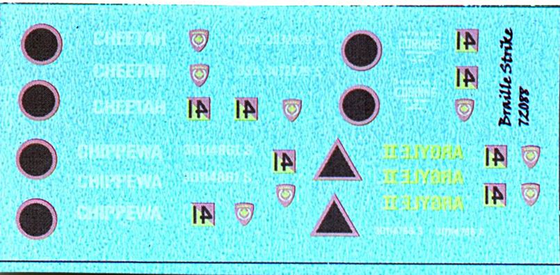 Modelers should be aware that the drawings used in the instructions are only meant as a help for placing the decals, and not for the specific features of the tank. For instance, CORINNE had a spare roadwheel mounted on the turret sides; ARGYLE II had both a roadwheel and spare tracks, together with a rack on the hull sides; CHEETAH had a faint trace of the previous white star marking under the new squadron symbol, etc. According to the instruction sheet, all of these tanks were equipped with T80 tracks. Looking