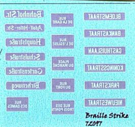 This set covers a number of street signs in German, French and Dutch, without indicating to which area they would best be suited, as I can imagine that the design varied from country to country and, perhaps, even from region to region. (The three languages present on this sheet might, for instance work for France, Belgium, the Netherlands, Germany and Austria.) Looking