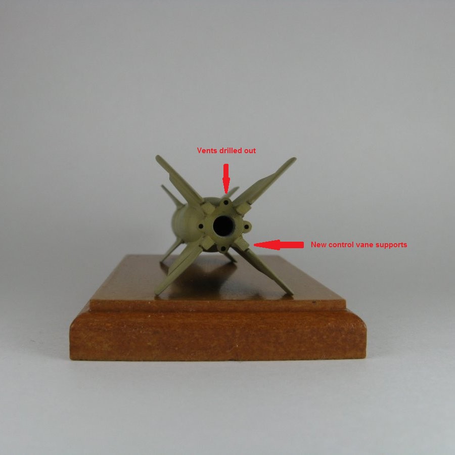 everything sat. Then I added four new control vane supports fashioned from some square styrene rod, glued them to the rocket's butt end and added small sections of round