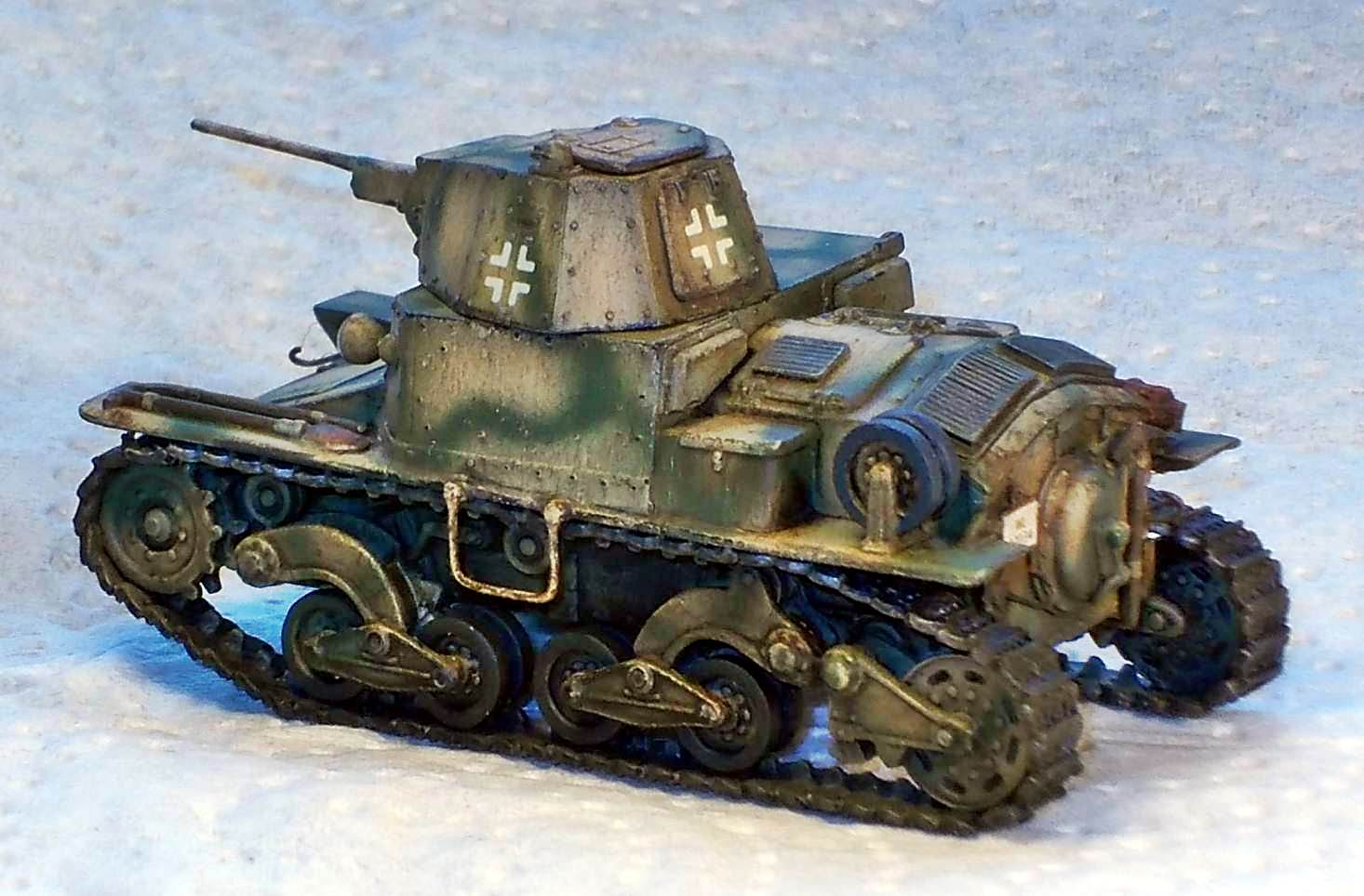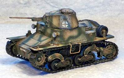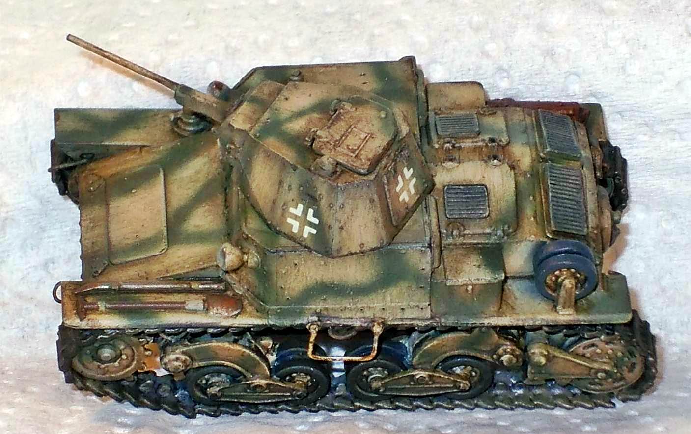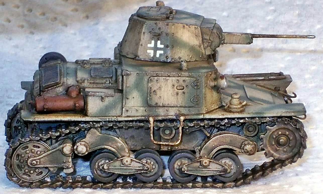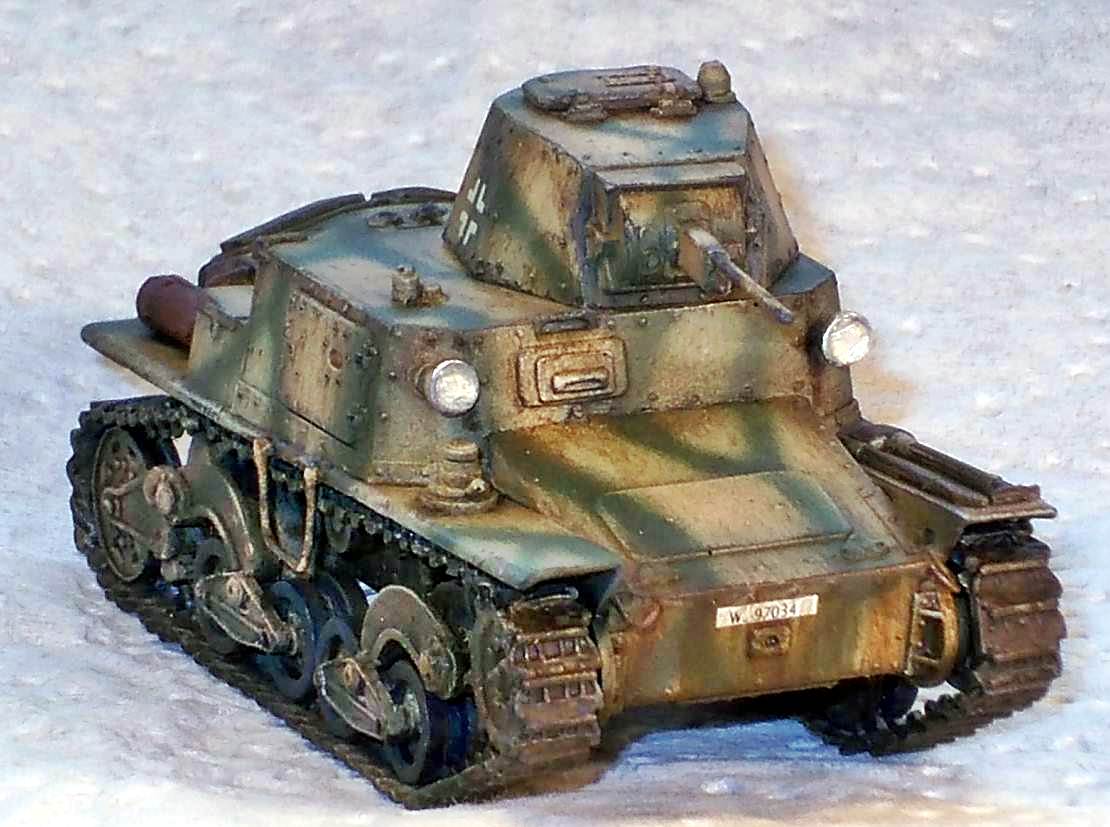 but is otherwise solid and cast integrally with the gun. The manual mentions the use of metal rod to make a tow hook and foot steps. As I understand it, this metal rod should be included, but it wasn't. I used some brass rod I had lying around. It seems I have not positioned the front tow hooks correctly as they should be higher up the hull. I might also have missed a towing eye on the nose of the kit. At this point I compared the look of the kit with the limited references I had. Not having any scale drawings that I could truest for the full 100%, I mainly looked at pictures and compared them with the kit. It seems the look of the vehicle has been captured well. I chose to represent a German vehicle and painted it as such. It is difficult to tell from the pictures I have seen whether the return rollers had rubber tyres or not. As the kit comes without decals, I dove into my spares box and used Balkenkreuze from an old 1/76 Fujimi PzKpfw38(t) (which 6 years after finishing the kit had become gooey). The licence plates came from Decal Details MI-109, which incidentally also has Italian markings.