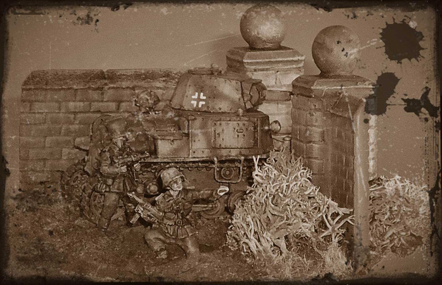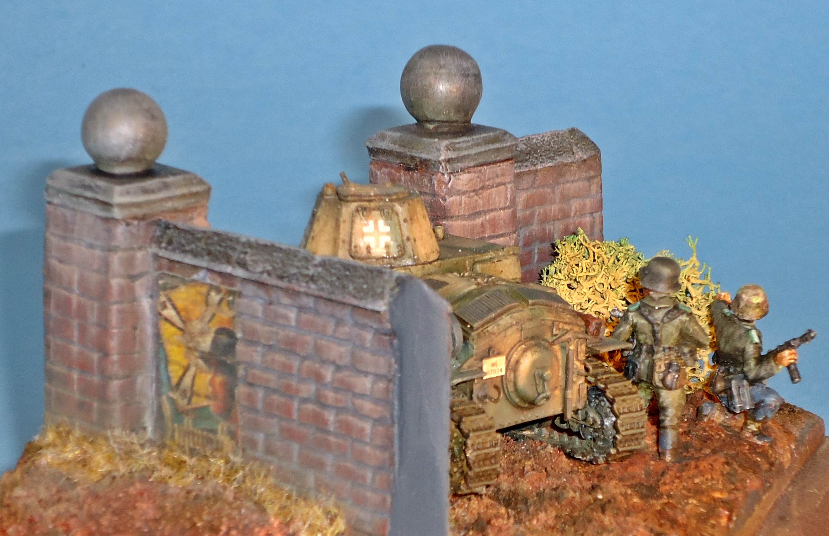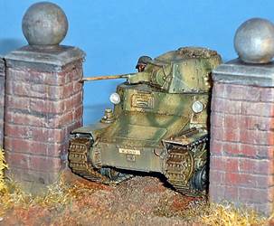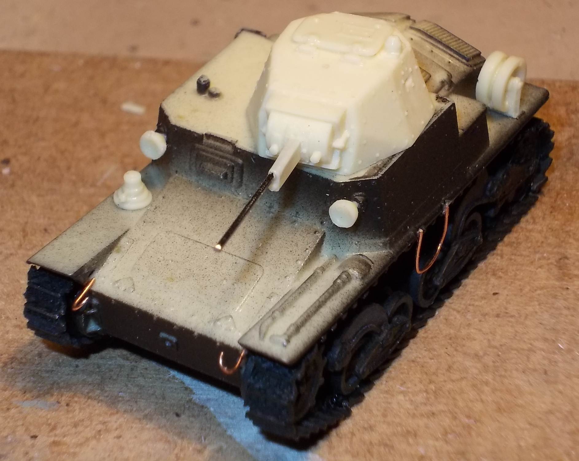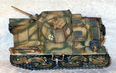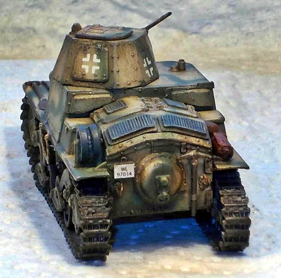 but is otherwise solid and cast integrally with the gun. The manual mentions the use of metal rod to make a tow hook and foot steps. As I understand it, this metal rod should be included, but it wasn't. I used some brass rod I had lying around. It seems I have not positioned the front tow hooks correctly as they should be higher up the hull. I might also have missed a towing eye on the nose of the kit. At this point I compared the look of the kit with the limited references I had. Not having any scale drawings that I could truest for the full 100%, I mainly looked at pictures and compared them with the kit. It seems the look of the vehicle has been captured well. I chose to represent a German vehicle and painted it as such. It is difficult to tell from the pictures I have seen whether the return rollers had rubber tyres or not. As the kit comes without decals, I dove into my spares box and used Balkenkreuze from an old 1/76 Fujimi PzKpfw38(t) (which 6 years after finishing the kit had become gooey). The licence plates came from Decal Details MI-109, which incidentally also has Italian markings.