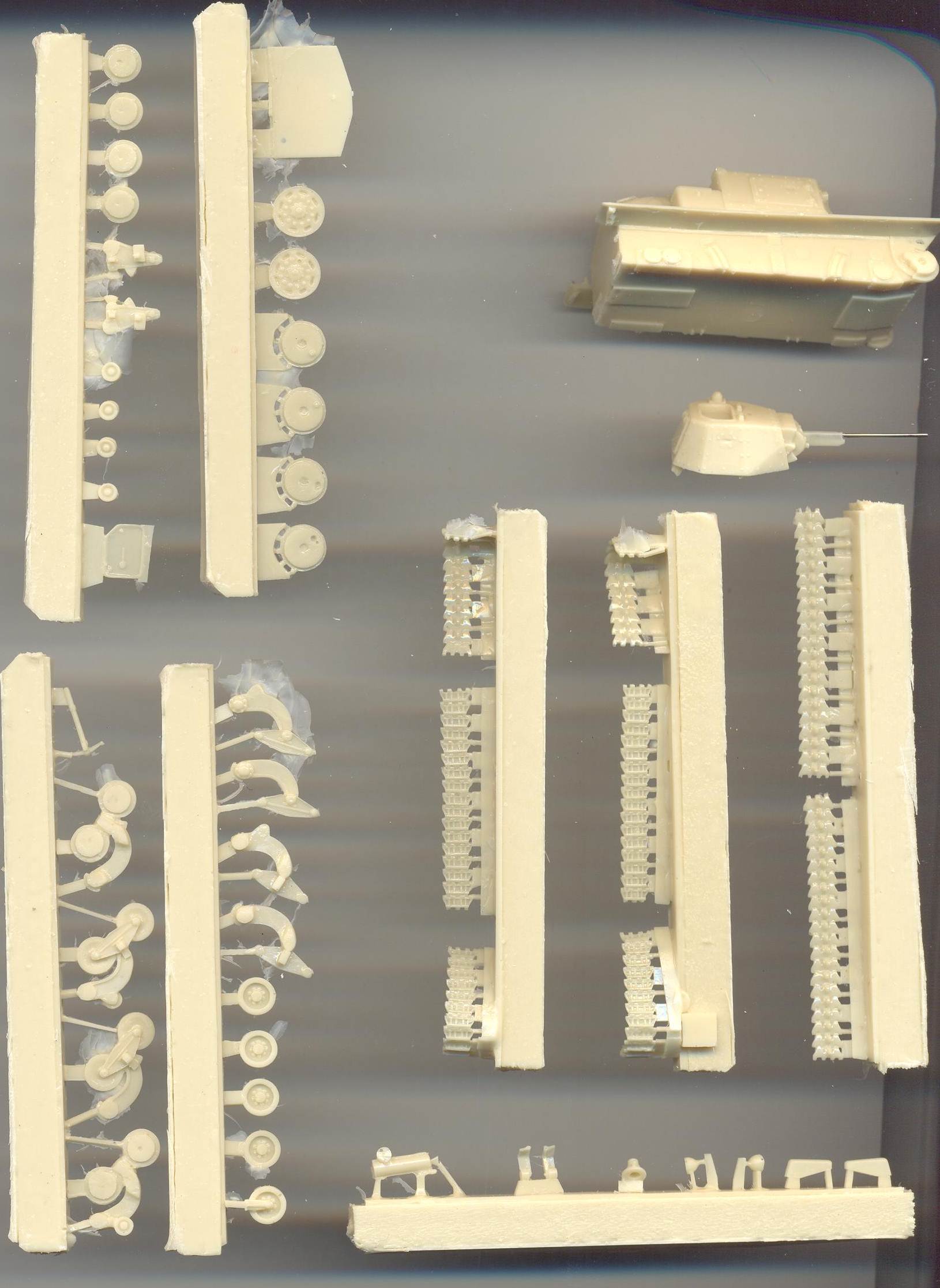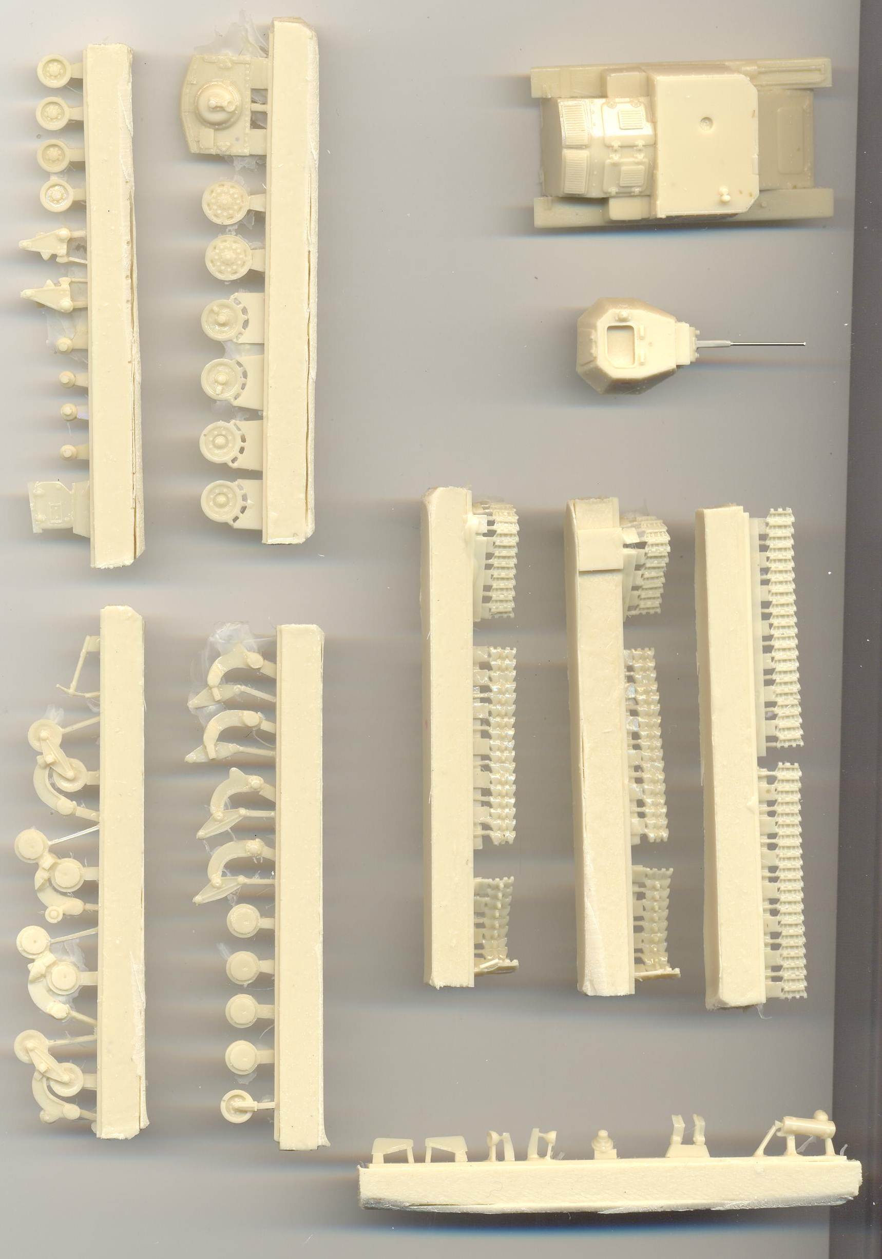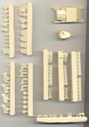 halves were well-aligned. The resin tracks come as pre-assembled sections, four per side. I like this, as the thought of having to bend resin tracks by heating them has always scared me sheetless. The tracks are not too bad what the level of detail is concerned, but suffer from too many blemishes and aren't always perfectly pre-assembled straight. I found