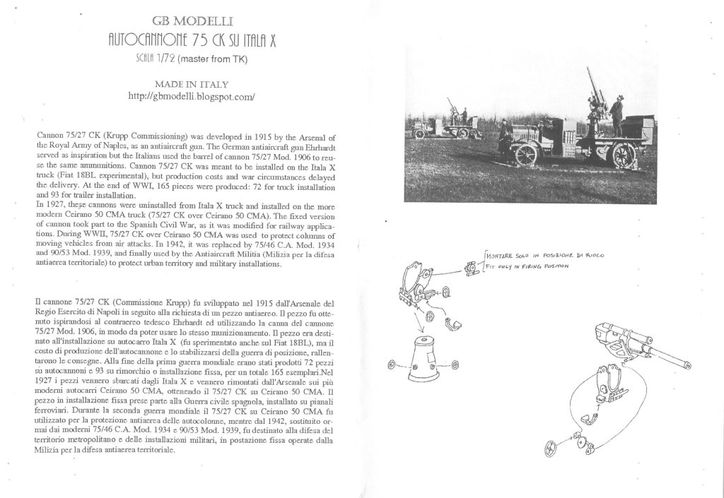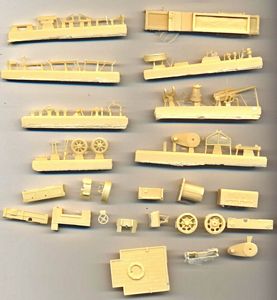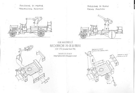 What you find inside the kit and how to assemble it The kit comes in a small plastic bag with the label at the top. The label has a small black & white photo of one of the most famous shots of this so old and rare vehicle. The model consists of around 60 light-amber-colored, cast resin parts, quite a great number for a resin kit. Parts are nicely cast, with no bubbles or warping. Many of the pieces are incredibly tiny and delicate, which made me think that I was surely going to break a number of them, which did not happen either because of my supernatural ability (difficult to believe) or because the pieces are intelligently secured, so that they can be removed easily. I was also surprised by the very small amount of flash which can be found. The assembly instructions are the standard exploded-view style with no written instruction. A brief inspection makes it easy to understand that there are no compromises between scale and historical accuracy. Every single detail is there: believe it or not, the three pedals are separate and must be assembled, as you can see from the photo below (one of the worst moment of my whole modeller's life was when one of the pedals fell to the ground from the tweezers - one of the best moments was when I got it back !). Two of the pedals are identical and must be glued close to each other and another one is different and must occupy another hole on the right. Despite their dimensions, you can notice the differences between the three and need to pay attention to choose the right one. Pieces go together very easily, so that no filing or cutting is required to make them go where they should. There are five very small and delicate wheels which must be glued to the gun: the bigger one goes on the right upper side, as it can be deducted by carefully observing the instructions. Speaking about the gun, it is a beautiful kit in itself, and it is also sold separately as a stand-alone piece (kit # 72014). The elevation is not fixed, even though you must choose the one you want before assembling the traversing mechanism, which sadly stops the gun from moving. The muzzle comes pre-drilled, even though drilling it would not be difficult. ![]() The vehicle can be mounted both in travelling or in firing position, and the differences can be clearly spotted in the instructions on the left. I know I am asking for too much, but it would have been really great if the ammunition container between the cabin and the gun were provided both in closed and open position, with the shells visible, as we can see it was during firing. |