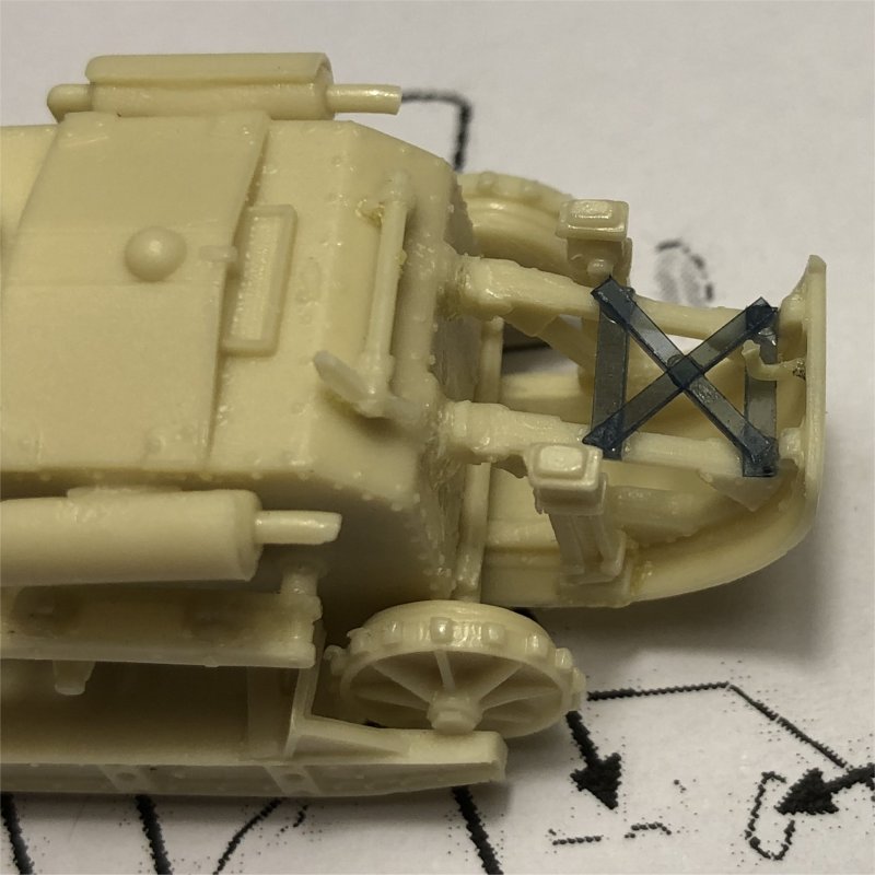 - There was a cross-shaped support on the upper part of the tail which was not reproduced in the kit because it was impossible to cast it as thin as it has to be, so I scratched it with plastic card; behind it, on the upper border of the tail, a hook was present, supporting a chain with squared links which progressively disappeared during the long life of the tank. That hook is not present in the kit and was easily scrathchbuilt.