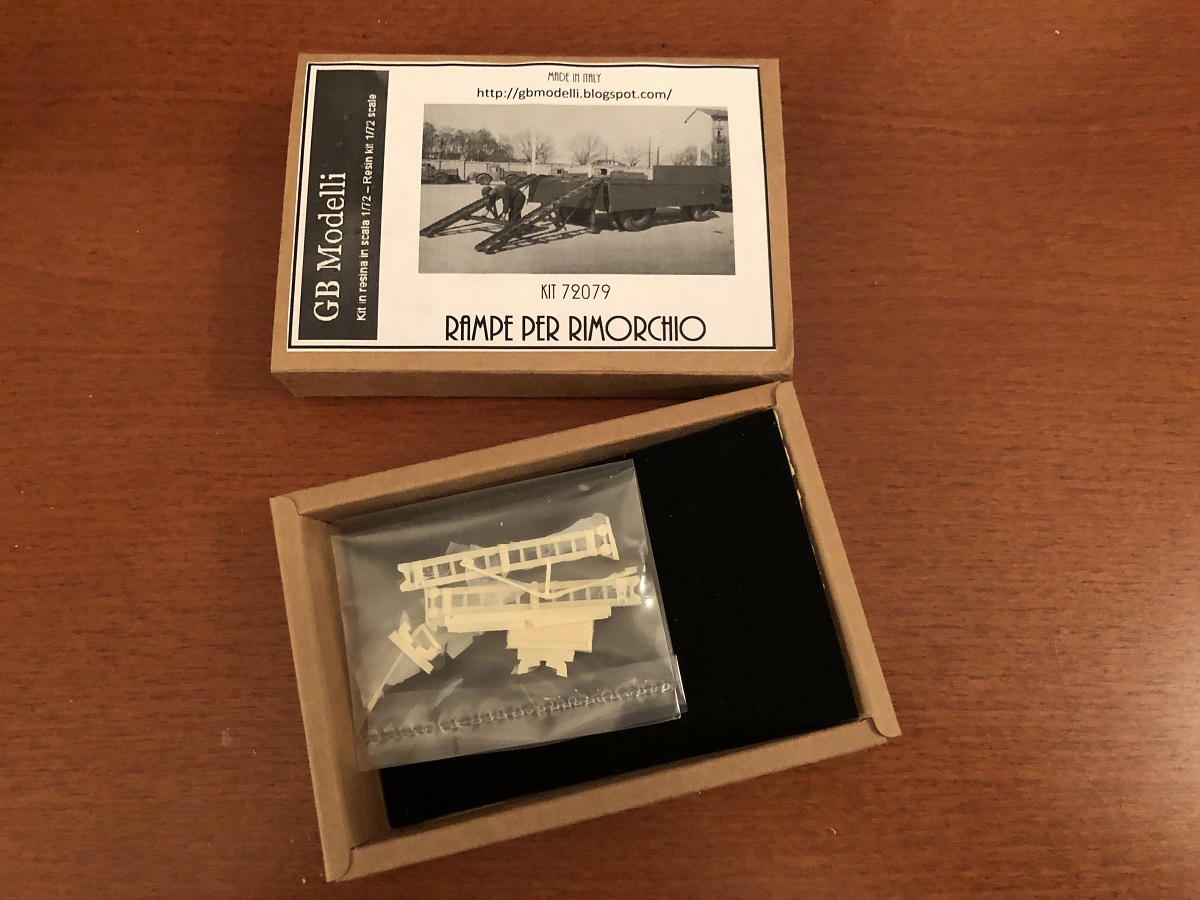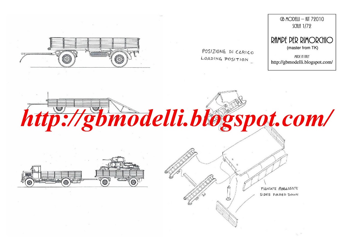 | These removable ramps were specifically designed for loading/unloading M-serie tanks (M13/40, M14/41 and derivatives) from the Viberti trailer, so that their width was precisely matching that of the M-serie tracks. They must be paired with the Viberti trailer, which GB Modelli sells as a separate kit. Together, they look a good complement to the M13/40 which is produced by GB Modelli. I am happy to see that GB Modelli has started protecting their kits with a sturdy cardboard box, while previously they were sold in simple, unprotected plastic bags. The parts are very crisply molded, with quite a bit of flash, which is something you must expect from limited-production resin kits; being very thin, it can be easily separated form the pieces. No warping, no pin-holes and minimal attachment blocks. The resin is soft enough to be easily cut with a sharp hobby knife without splintering or excessive effort. The model is well-engineered, so that it is possible to build it in loading/unloading state and in transport mode. The website of GBModelli has a page where pictures of the real trailer with ramps are shown, which will further ease construction.