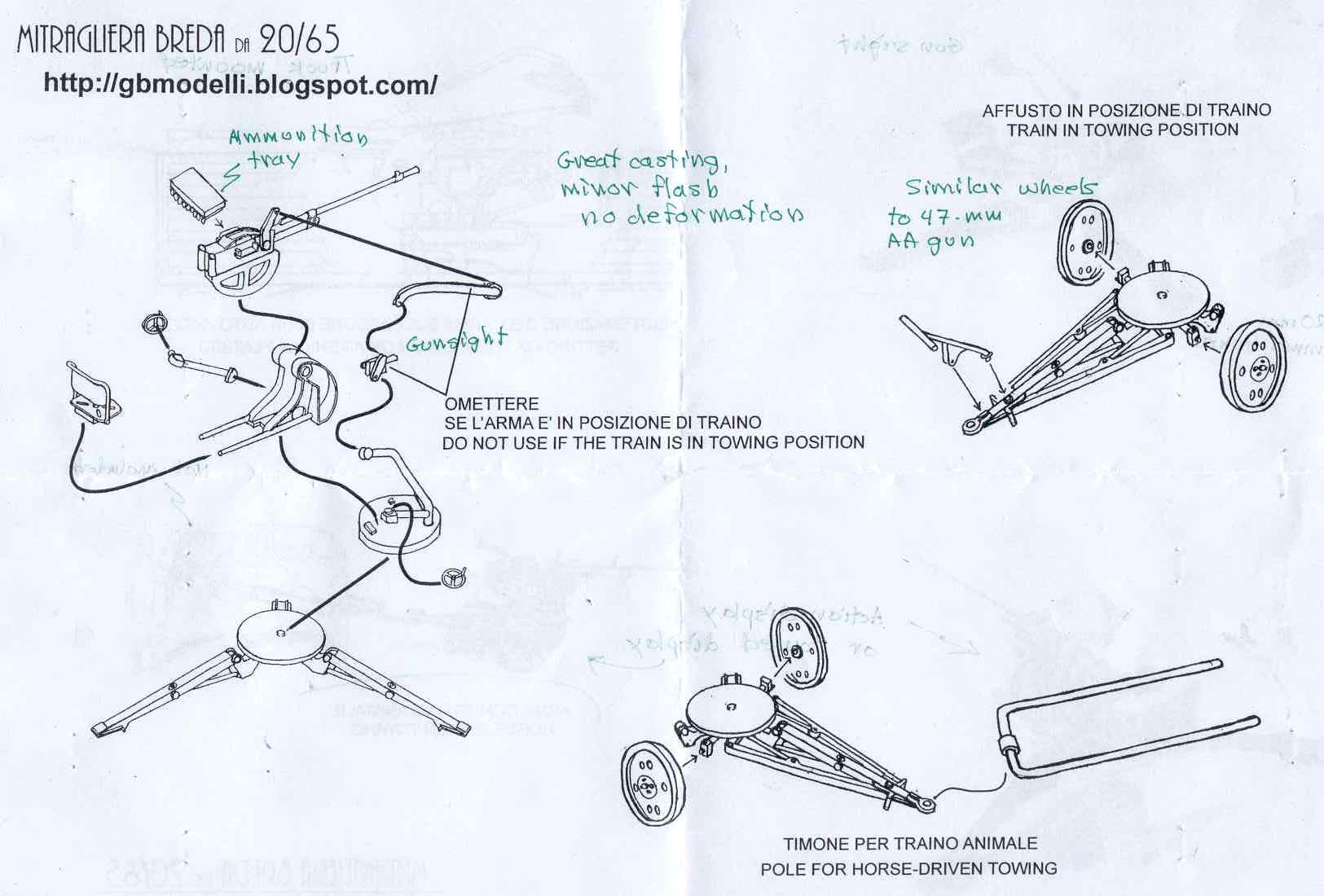 Instructions The 2nd page of GB Modelli's instructions portray the gun deployed, and mounted on a truck bed without the tripod legs, and being towed by a mule or donkey; the donkey and crew figure are not included in the model. After assembly I believe that while serving in North Africa the weapon would be finished in gunmetal and desert tan. The gun in Italy, the Balkans and Russia would be colored gunmetal and gray-green color. |