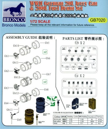 Conclusions Some 1/72 kits of WW2 German vehicles offer jerrycans and, in a very few cases, drums, and Esci (later Italeri) produced a set of WW2 accessories with drums, so this is not the first attempt at producing these fundamental elements, but this is the very first kit dedicated specifically to German ones, which happened to be rather different from those used by other countries during WW2: evidence suggests that this set reproduces the original ones in an extremely accurate way, so this is a very welcome set which I hope will not be the first and last one from Bronco Models in 1/72. |