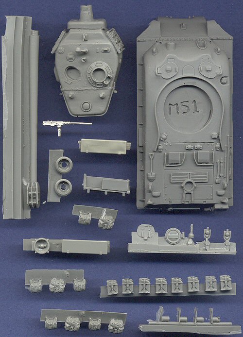 ![]() Another Sherman conversion from CPL Overby, this one is meant to convert Hasegawa's M4A3E8 into the 105mm-armed M51 Sherman. The HVS suspension from the plastic Hasegawa kit is required to complete this conversion. The hull is based on an ESCI M4A1 Sherman hull, but it is modified to accomodate the Cummings diesel engine. All of the pioneer tools are molded onto the hull, with fairly decent relief, though I will likely replace them anyway (I'm very picky about those things). All lift rings are molded open, which is pretty impressive for a resin kit, though the crew hatches are closed. Many stowage items (spare wheels, tool boxes, fuel cans, bags and packs) are provided as separate parts. Headlights and tail lights are molded onto the hull and definately need to be replaced with new lights and etched brass brush guards. I do not know if stowage on these tanks was standardized, but the photos I have seen of the M51 show there to be two smaller boxes mounted on each hull side, instead of one longer box on each side, as provided with this kit. But as in all cases, the best way to build these Israeli Shermans is to use any photo of your choice as your reference. The turret is a modified T23 turret from the Hasegawa kit, which means that it is rather large, bulky, and not shaped entirely correct. The gun mount has been modfied for the new cannon, and has the rear bustle has been enlarged. Spare track links are molded onto the turret sides and smoke grenade launchers are provided as separate parts. The hand-hold around the bustle is molded on, though it's a little heavy, and a very nice .50cal machinegun (cast in silver) is also included. Both crew hatches are molded open. The large spotlight is provided as a separate part. This kit is designed as a conversion for the Hasegawa HVSS Sherman, and needs the wheels and tracks from that plastic kit. Although I dislike the tracks in the Hasegawa kit, cast metal tracks have been marketed by Fine Scale Factory which could be used instead. (Keep in mind that both UM and Dragon will release HVSS Shermans hopefully this year. Their tracks and wheels will both likely be far better suited for this conversion than the Hasegawa parts.) The casting of this kit is very well done, with very few holes in the resin, all of which are easily fixed. This is a nice addition to CPL Overby's ever-expanding line of Sherman kits. Thank you to CPL Overby for providing the review sample. |