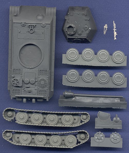As with Overby's other kits, this one is very well molded and simple to build. Some of the parts are on very thin resin carrier film that will be easy to clean up. There are only one or two air bubbles I've seen on the hull. The track is broken on one side, but the missing piece is in the kit bag, so it will be easy to fix. I am especially impressed with the nice AA machinegun and mount, which are cast in untreated silver (although I think the bipod mount should be removed from the MG).