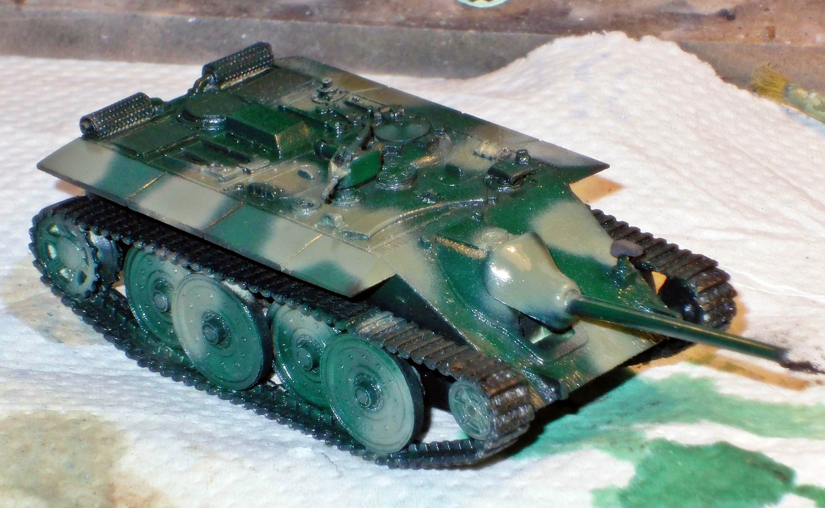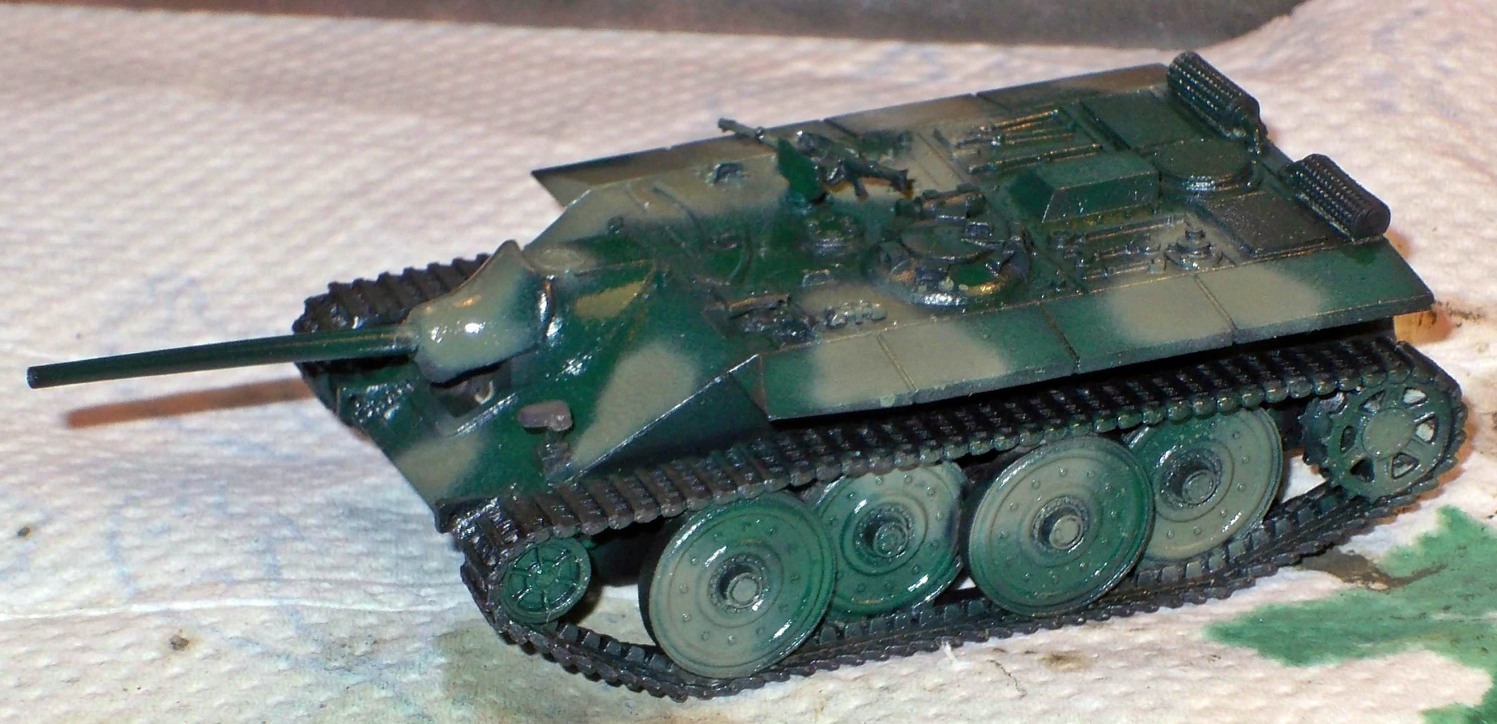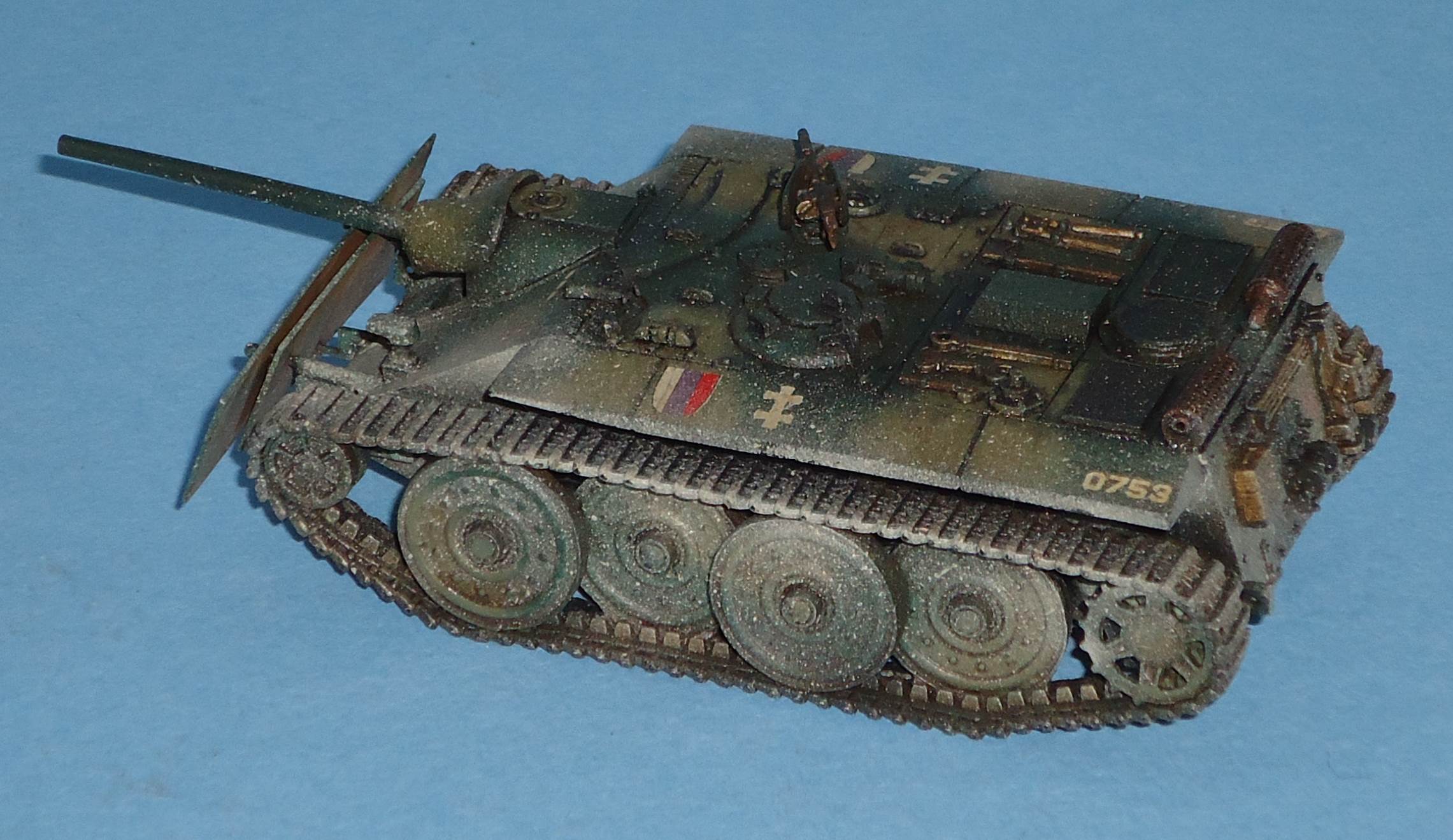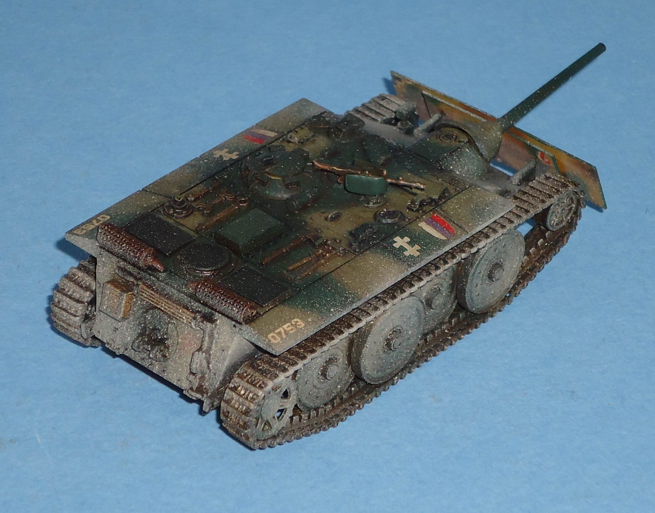 the track pins and track face detail. 5. Personal touch As I noticed there was a rather prominent gap below the gun mantlet (in the design, not just in the kit), I decided to add some spaced Vorpanzer made from plasticard and metal rods. I added two layers, the front layer also giving some protection to the tracks. 6. Painting and marking options No painting/marking options or decals are provided. Then again, the vehicle was never built, so let your imagination run wild. I mixed some colors together, and added Slovak decals from Aleran's AX-2 (Axis Minors) set.
