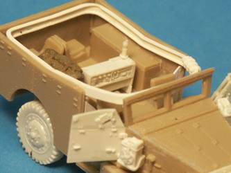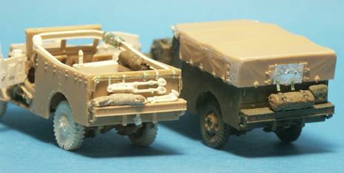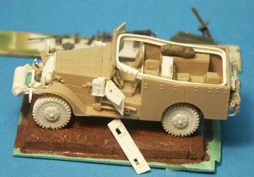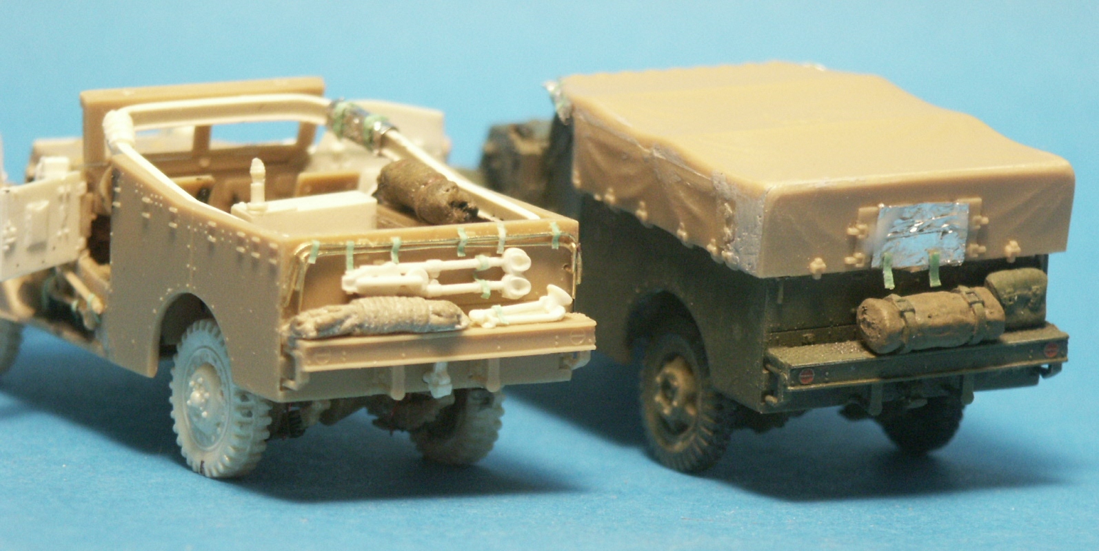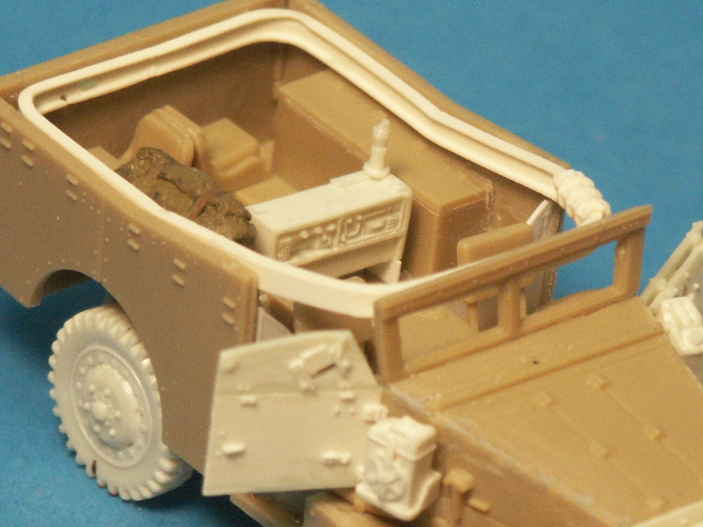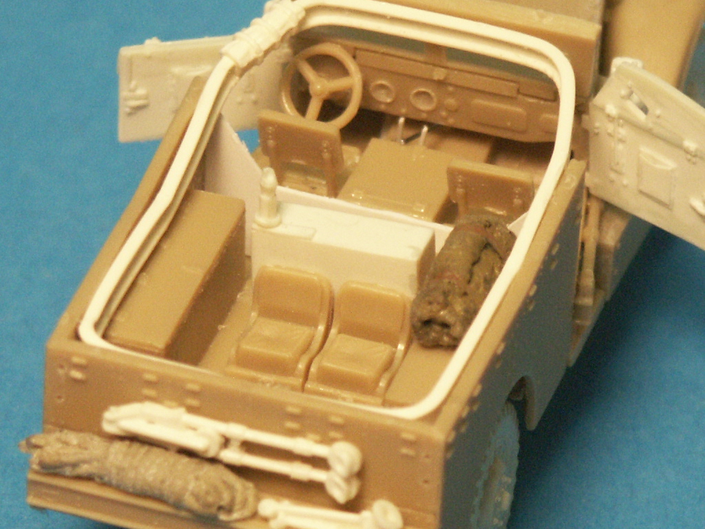 The rolled tarp wrapped around the rail above the driver’s door should go all around the rail and there was often one above the passenger’s door as well. The machine guns are left off till after painting so they don’t get accidentally broken off.