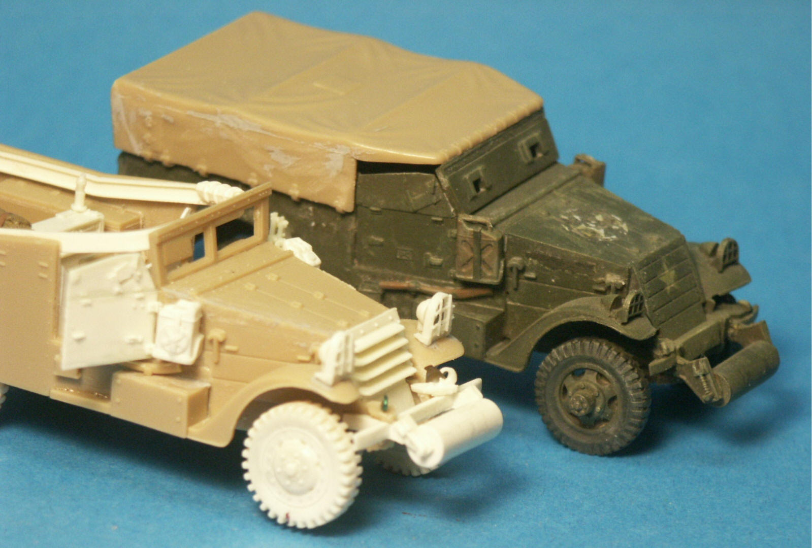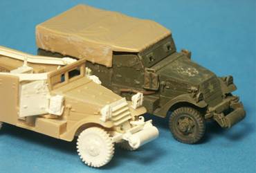 This photo shows well the two Scout Cars, an M3A1 at left and an M3 at right, prior to painting. Though intending to build the M3 version out of the box I could not resist a few improvements: the headlight bumps were shaved off, the old decals scraped off, and rolled canvas was simulated over the driver and passenger doors.
