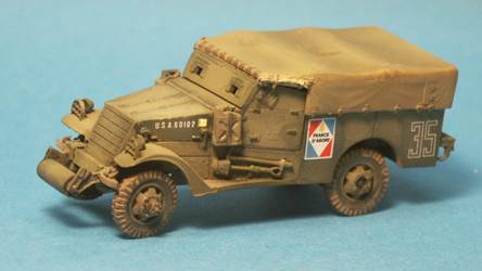On the M3A1 at left a good view of Overby’s machine gun tripods mounted on the rear below some canvas cover supports made from brass wire. Tie down straps were simulated with tape.