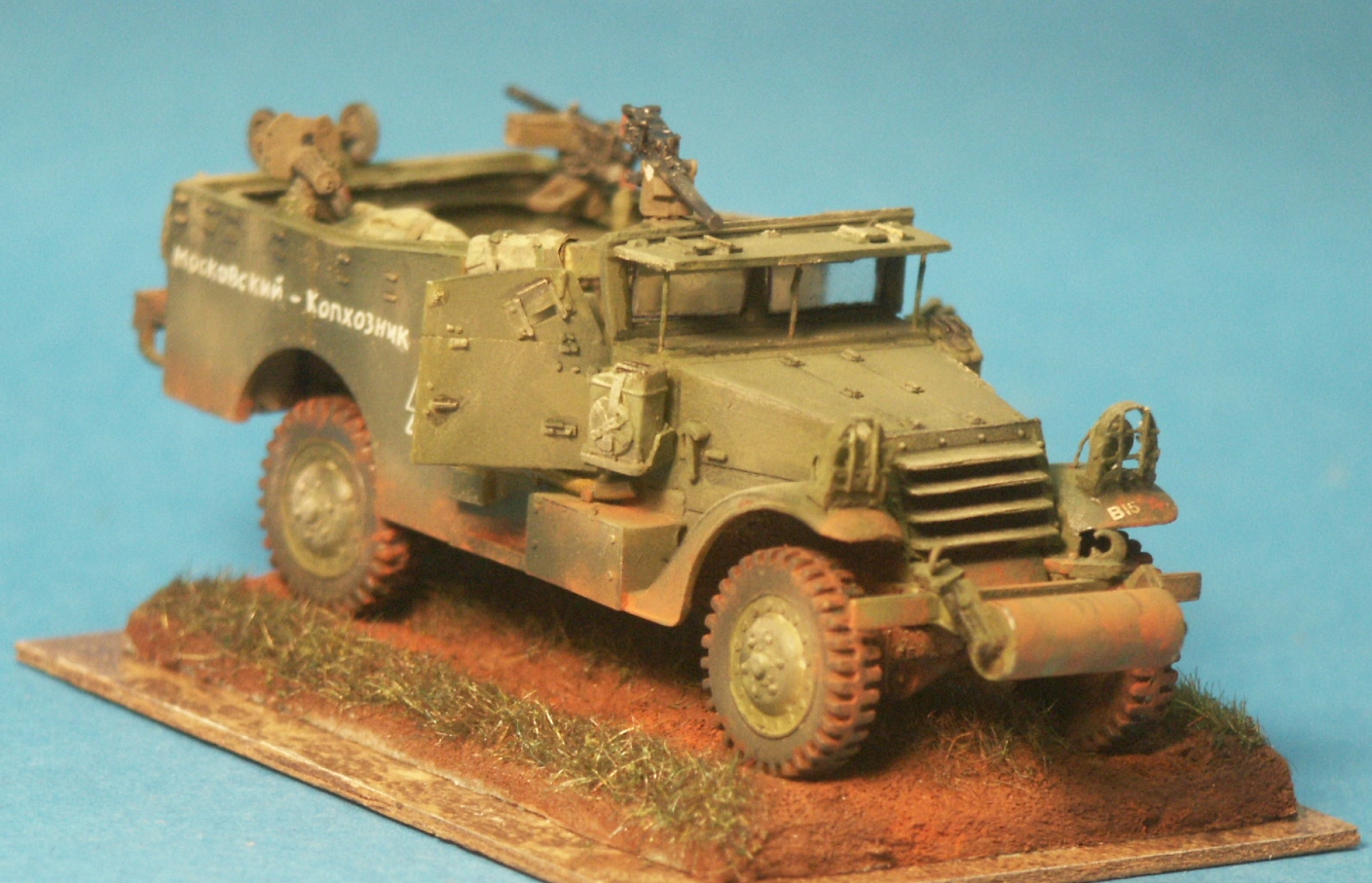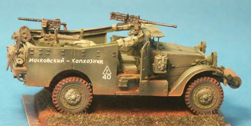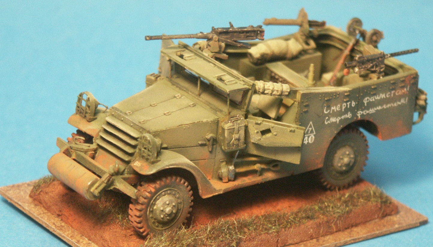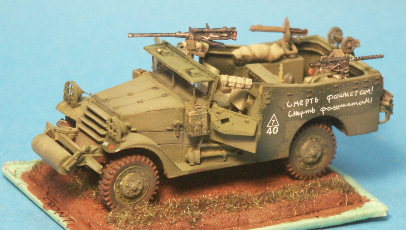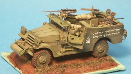 The M3A1 with Overby’s resin conversion parts, painted and with decals but waiting on the clear dullcoat and weathering so the hull matches the groundwork. You’ll notice that one of Overby’s machine guns has been replaced by a Russian Maxim gun, my attempt to make the M3A1 look a little more Soviet. I have no evidence that this machine gun would actually mount on the US machine gun mount.