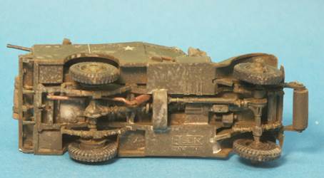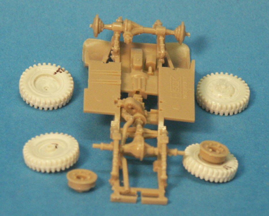 We see that ESCI molds the engine louvers closed. Rather than teardrop-shaped headlights, ESCI represents the headlights as raised blobs on the fenders. The hand tools are separately molded and look decent. The wheels here are the most obvious feature indicating this is an M3 variant of the Scout Car. Compare these with the wheels above with those below offered by Overby for the M3A1. (By the way, that is either dust or thick paint all over the model, not simulated mud.)