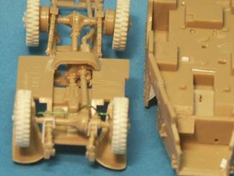 The kit underside was largely assembled out of the box except for some scratchbuilt details for the steering mechanism and bolt details. Overby’s replacement wheels have considerable nicer tire tread detail than the original kit tires.
