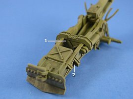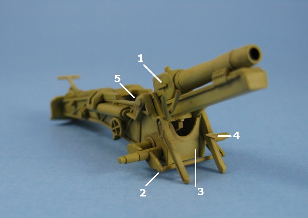 The shield was left as a separate assembly to be added following painting. The carriage followed. The upper shield braces (parts 22) are molded with a square cross section which is incorrect. It would be best to replace them